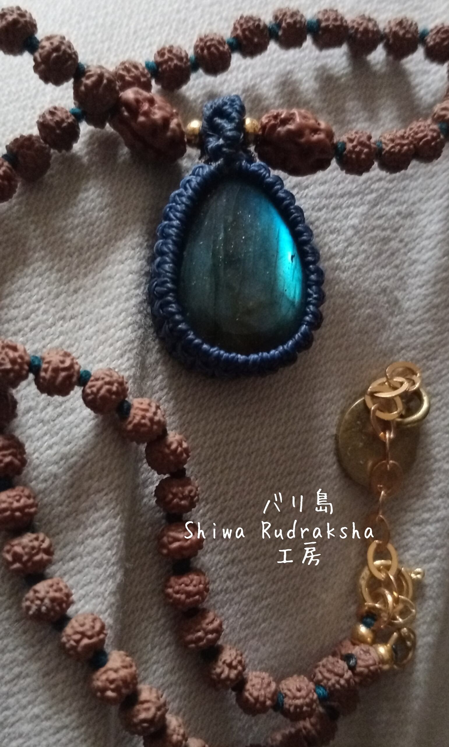 「ラブラドライト」と、小粒ルドラクシャ5面(5mm)を使用したネックレスです。