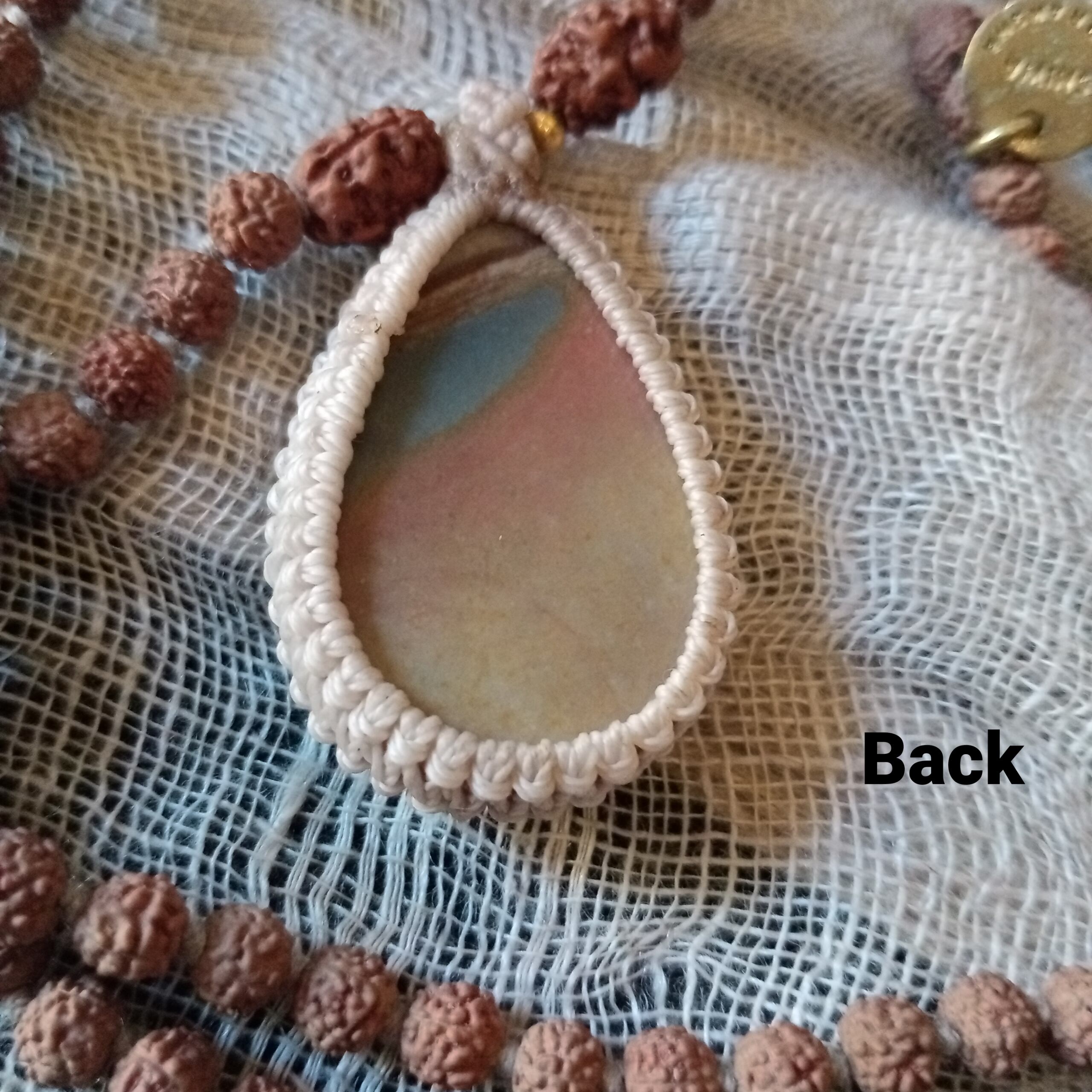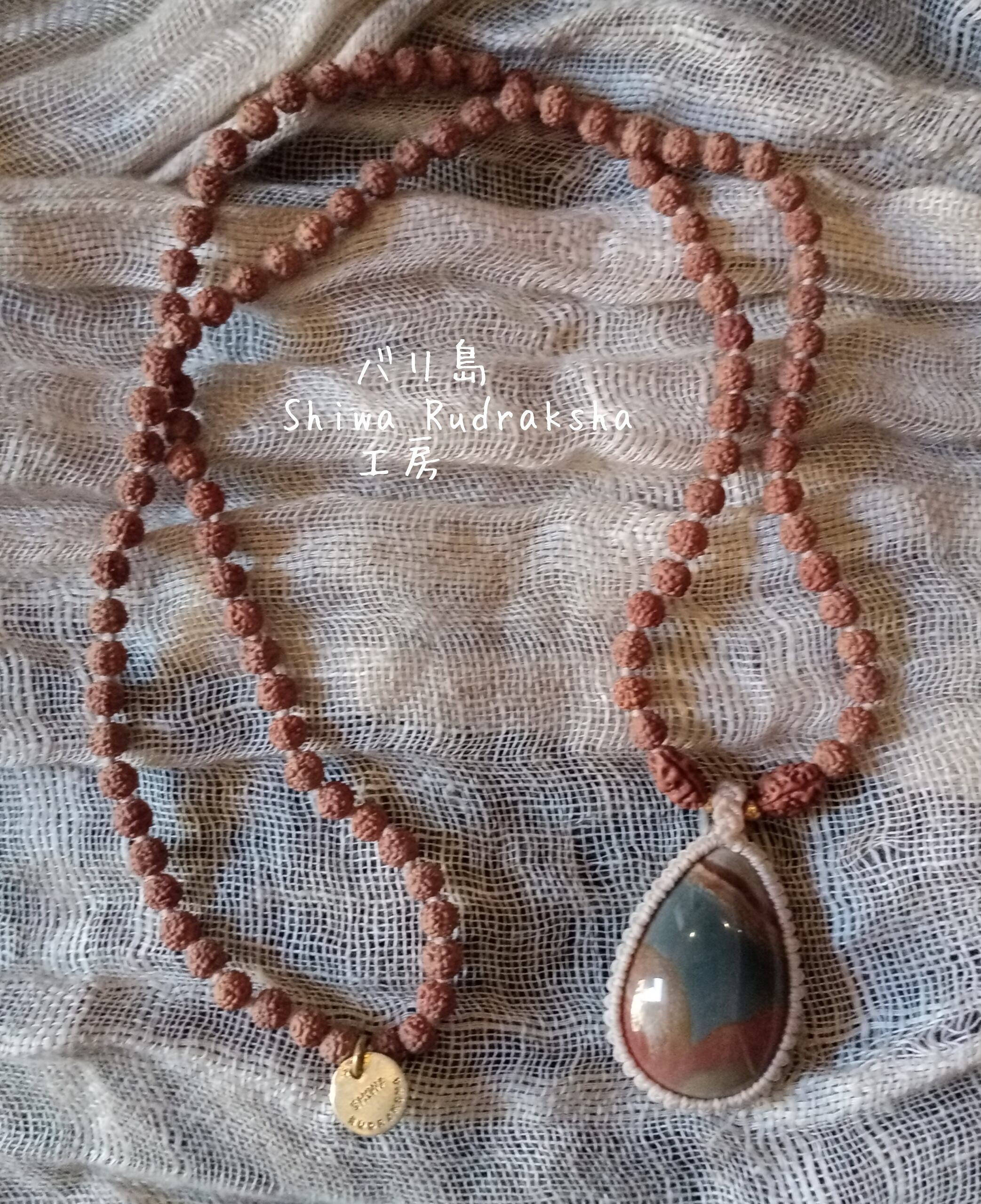 原石から買い付け研磨した「オーシャンジャスパー」をマクラメ加工のペンダントトップにしたルドラクシャ108粒マーラーです。