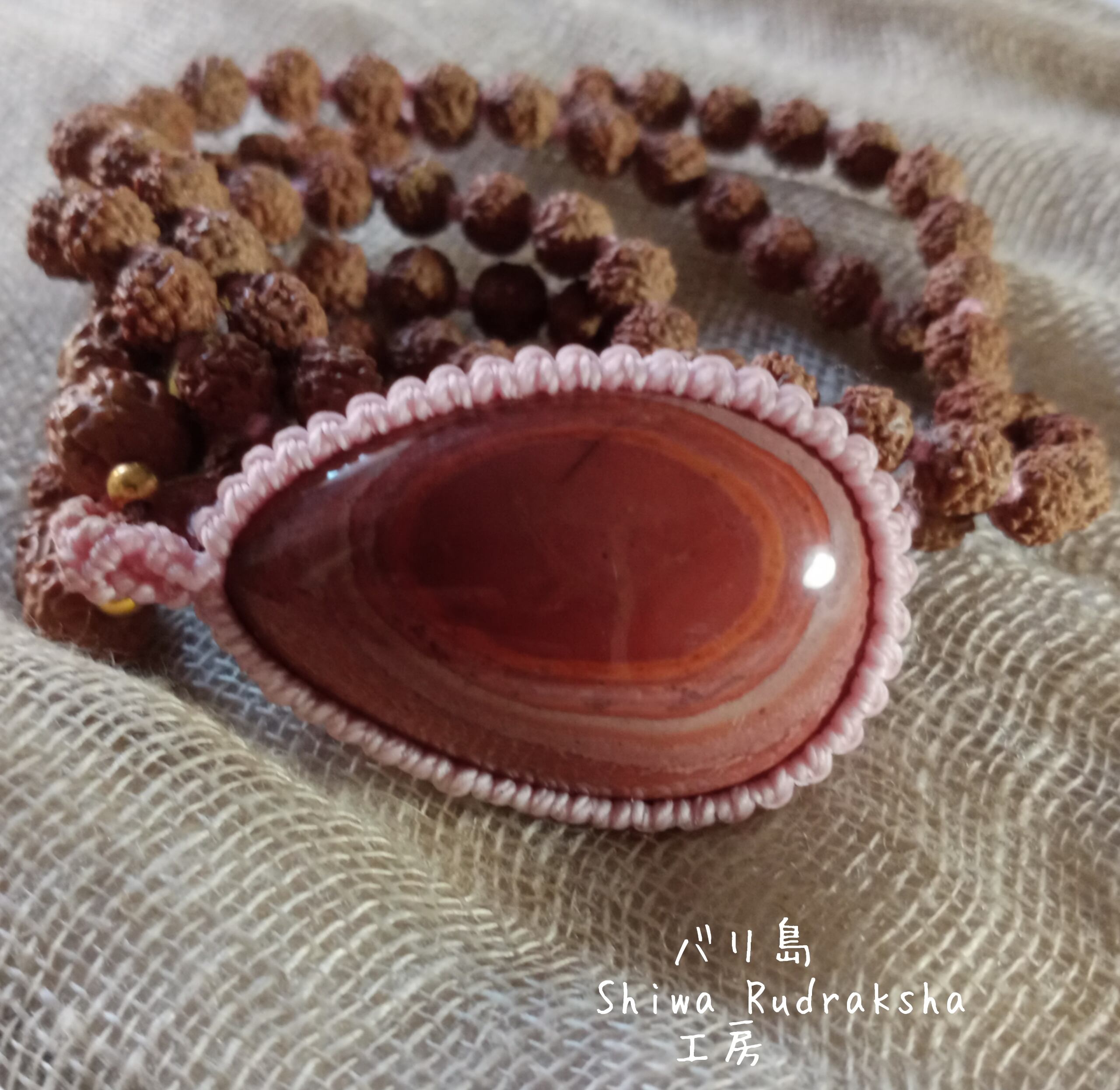 『オーシャンジャスパー』をマクラメ加工のペンダントトップにして、『人間関係を円滑にする。』と言われるルドラクシャ2面『シヴァ&パールヴァティ』と『幸福と繫栄』の象徴であるルドラクシャ7面「ラクシュミー女神」を組み入れた108粒マーラーです。