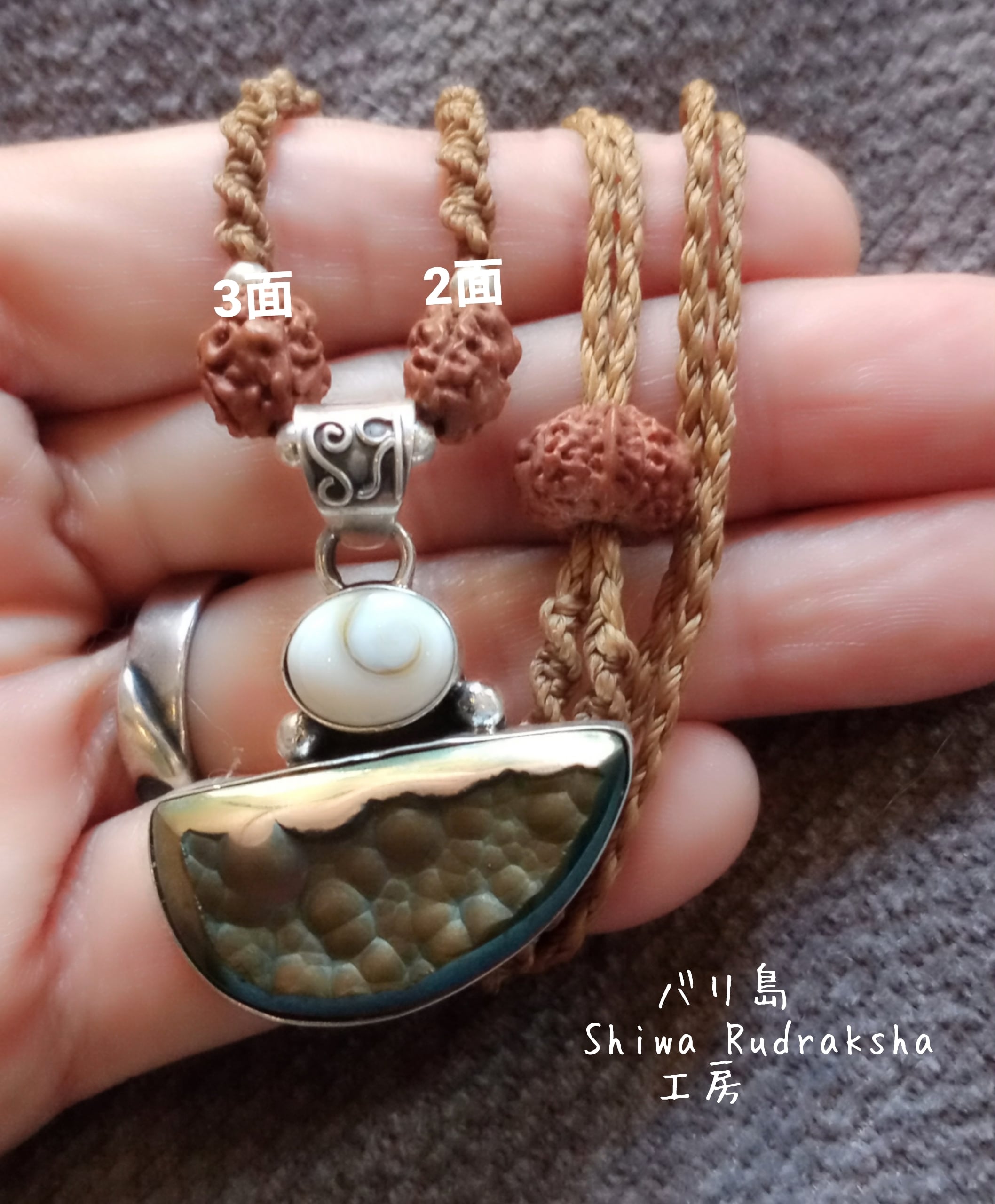 ルドラクシャは、「家庭円満&豊かな生活」のルドラクシャ2面(シヴァ&パールヴァティ)と「ヒンドゥー三大神が内在する」と言われる3面(アグニ)を組み入れました。
