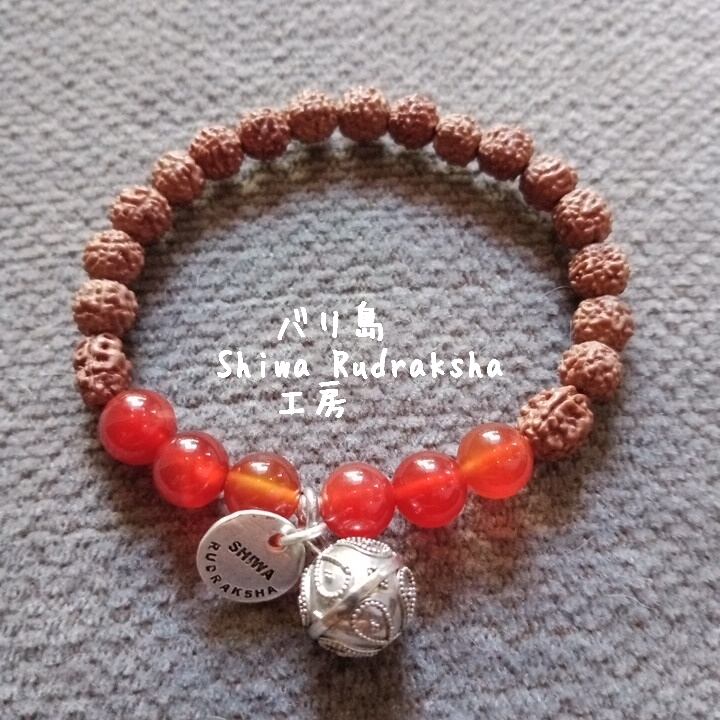 「カーネリアン」の間にガムランボールを挟み、左右に「ルドラクシャ2面シヴァ&パールヴァティ」と「ルドラクシャ3面アグニ」組み入れた可愛いブレスレットです。
