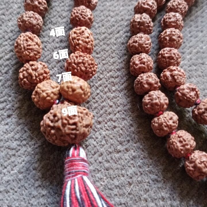 「学問や芸術の神様」をあらわす4面&6面ルドラクシャ「サラスヴァティ女神」と、「幸福と繁栄」の7面ルドラクシャ「ラクシュミー女神」、そして「恐怖からの解放」をもたらすとされる9面ルドラクシャ「ドゥルガー」をグルビーズにした108粒マーラーです。