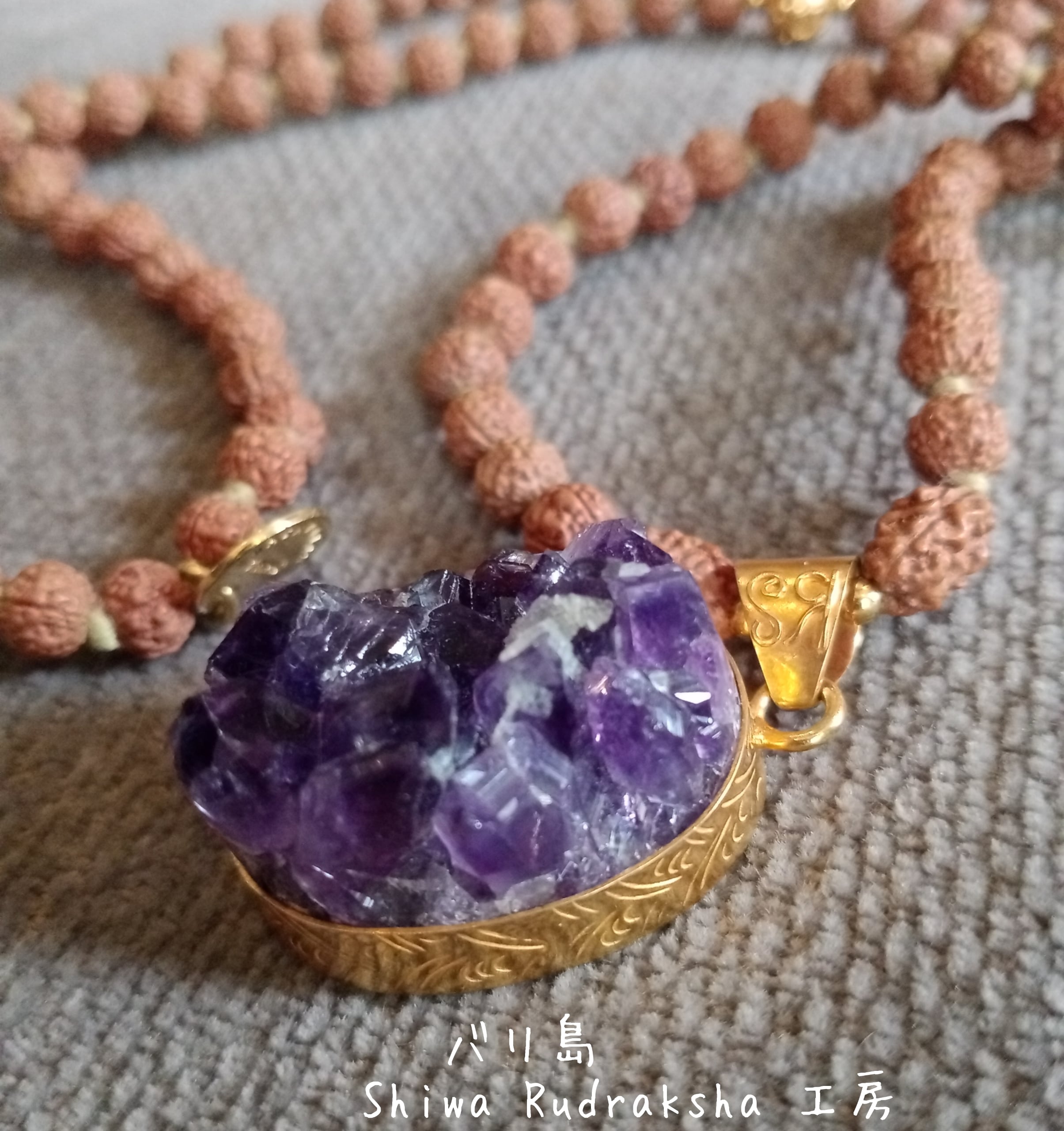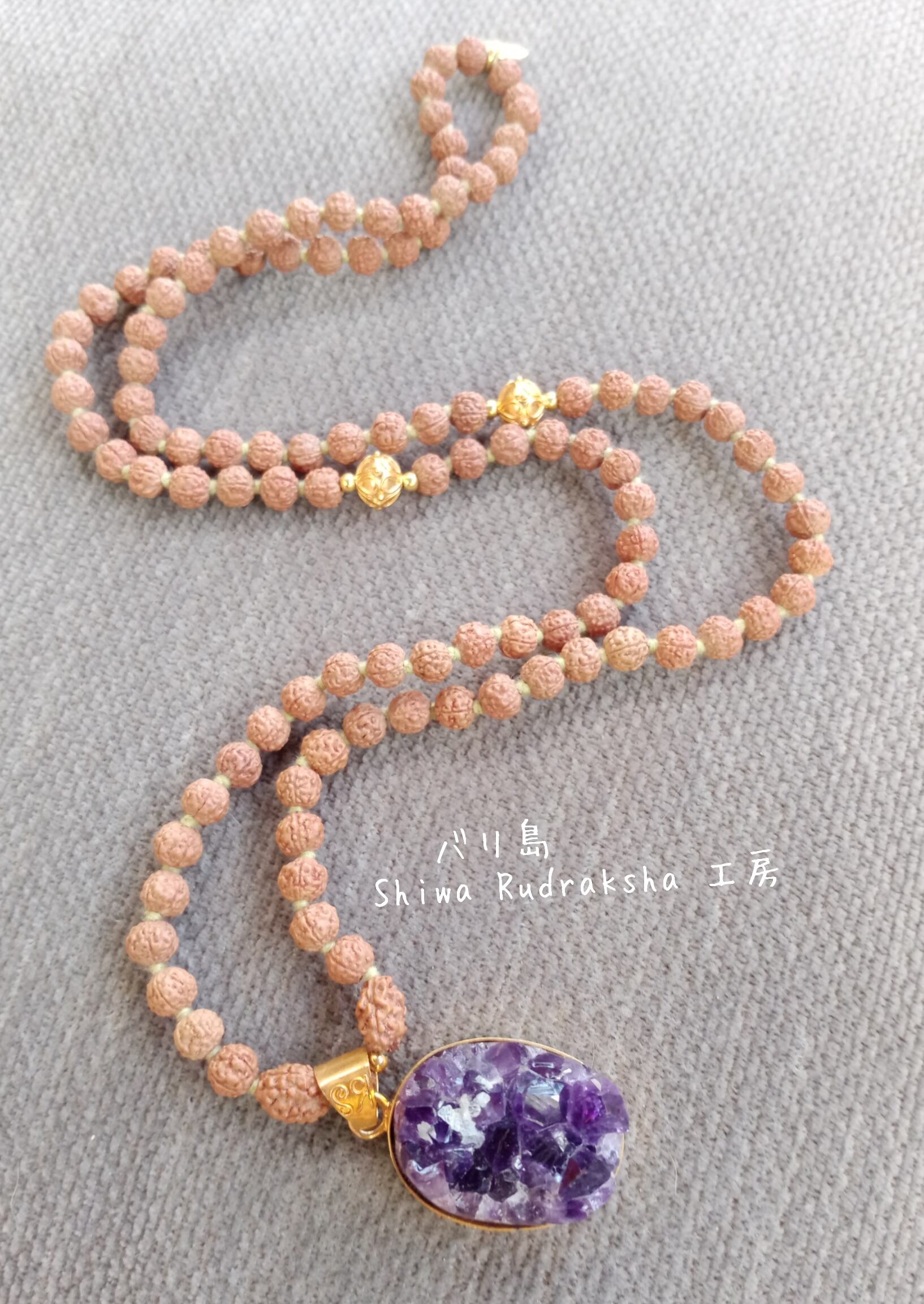 ★ルドラクシャ5面(約7mm) ・ルドラクシャ2面&3面(約縦11mm)・ガムランボール風ビーズ(約9mm)・アメジストクラスターペンダントトップ(約34mm×約24mm:24Kゴールドコーティング925シルバー)