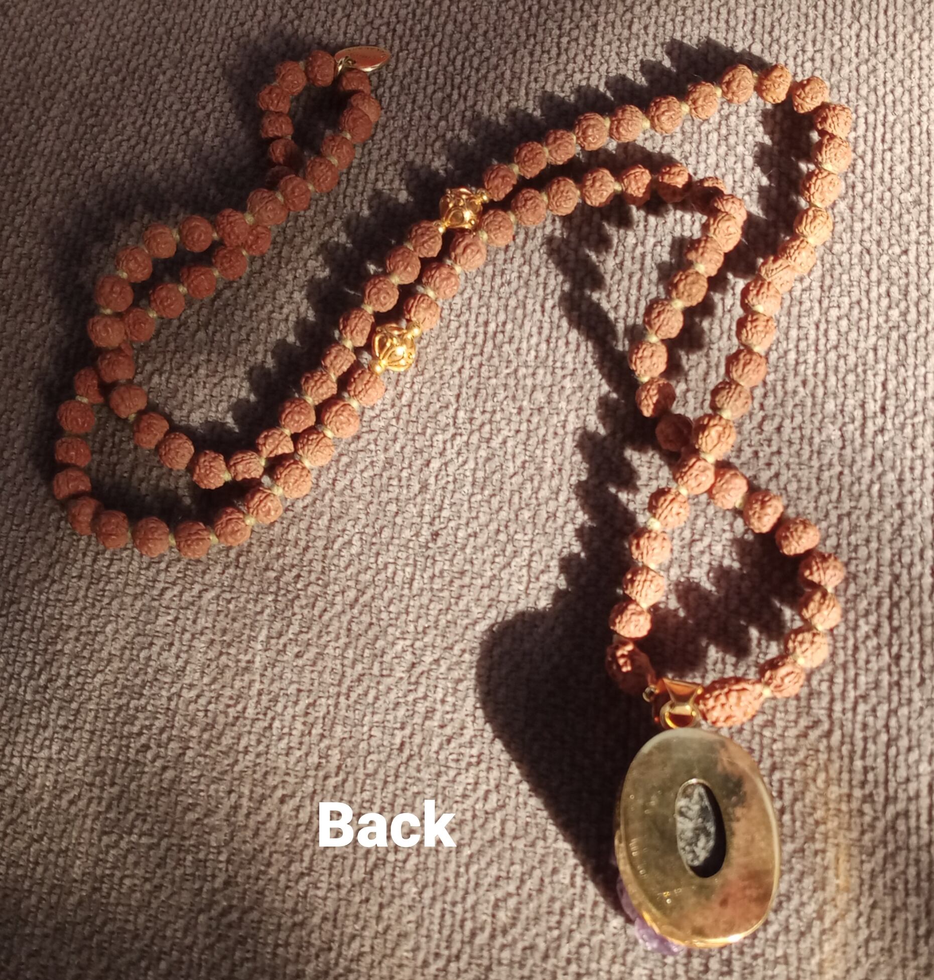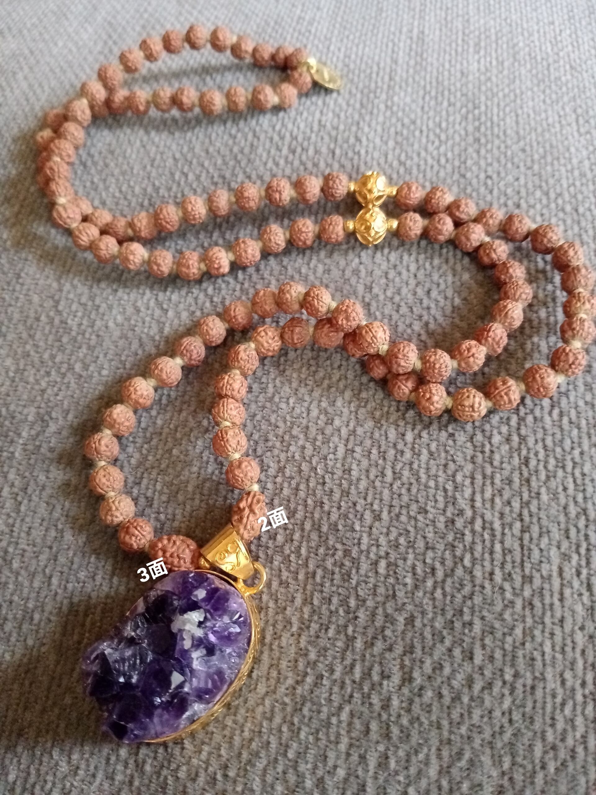 原石から買い付けた『アメジストクラスター』を卵型にカットして製作した、ペンダントトップをメインにした108粒マーラーです。