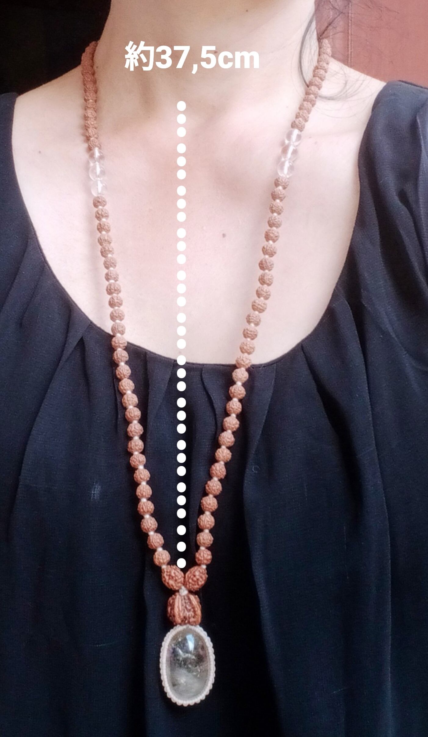 ルドラクシャは、ペンダントトップの左右に「ヒンドゥー三大神が内在する。」と言われる「3面アグニ」を組み入れ、ペンダントトップの上部にはレアビーズ「ダブルガネーシャ5面」を使用しています。