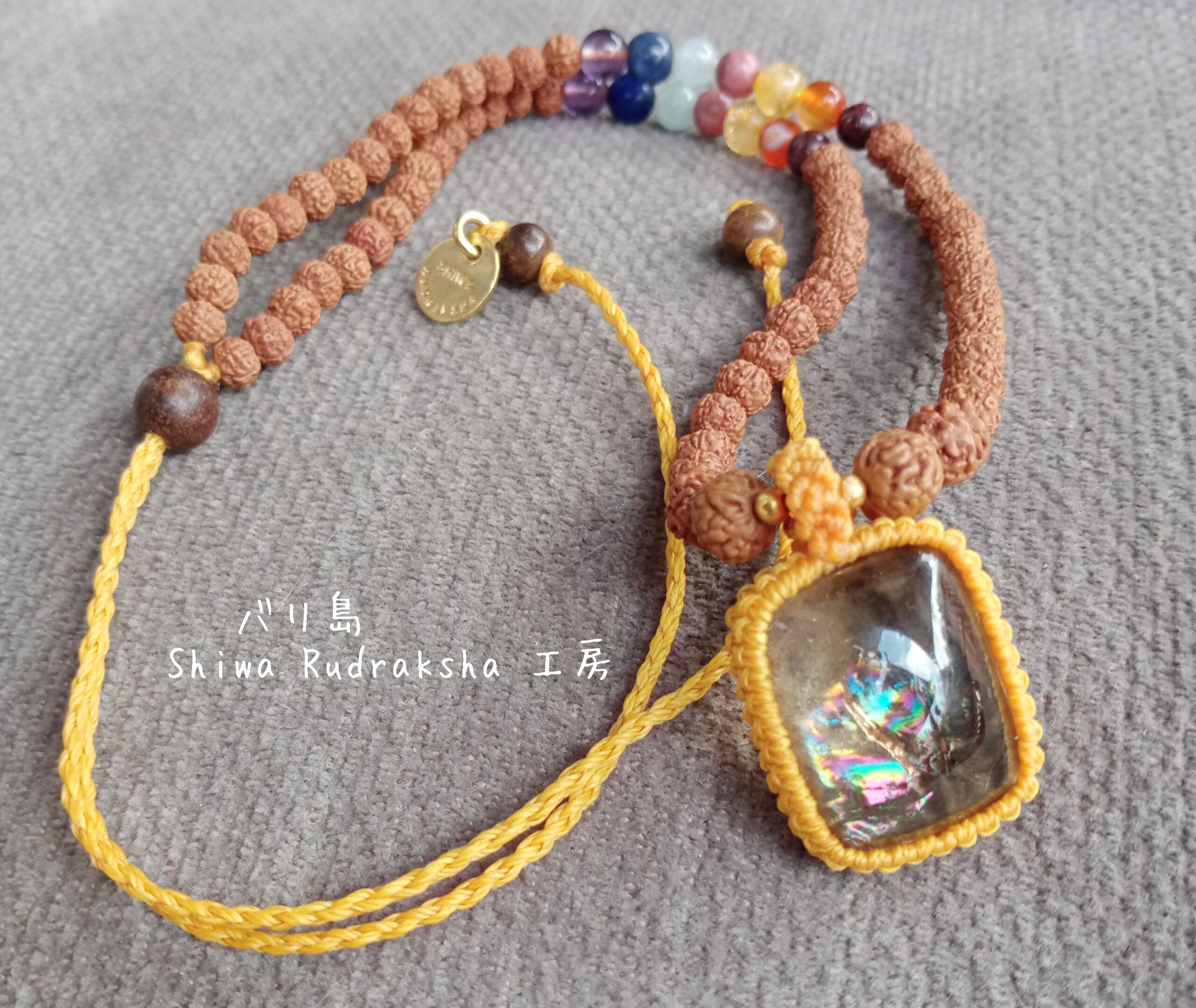 「インドネシア産スモーキークォーツ」をメインにした、7色のチャクラカラーとルドラクシャの調整可能な紐ネックレスです。