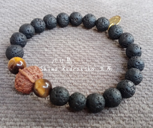 「鼻付きガネーシャ8面ルドラクシャ」を「タイガーアイ」で挟み、インドネシア産のエネルギッシュな火山の溶岩「ラヴァストーン」をふんだんに使用したブレスレットです。