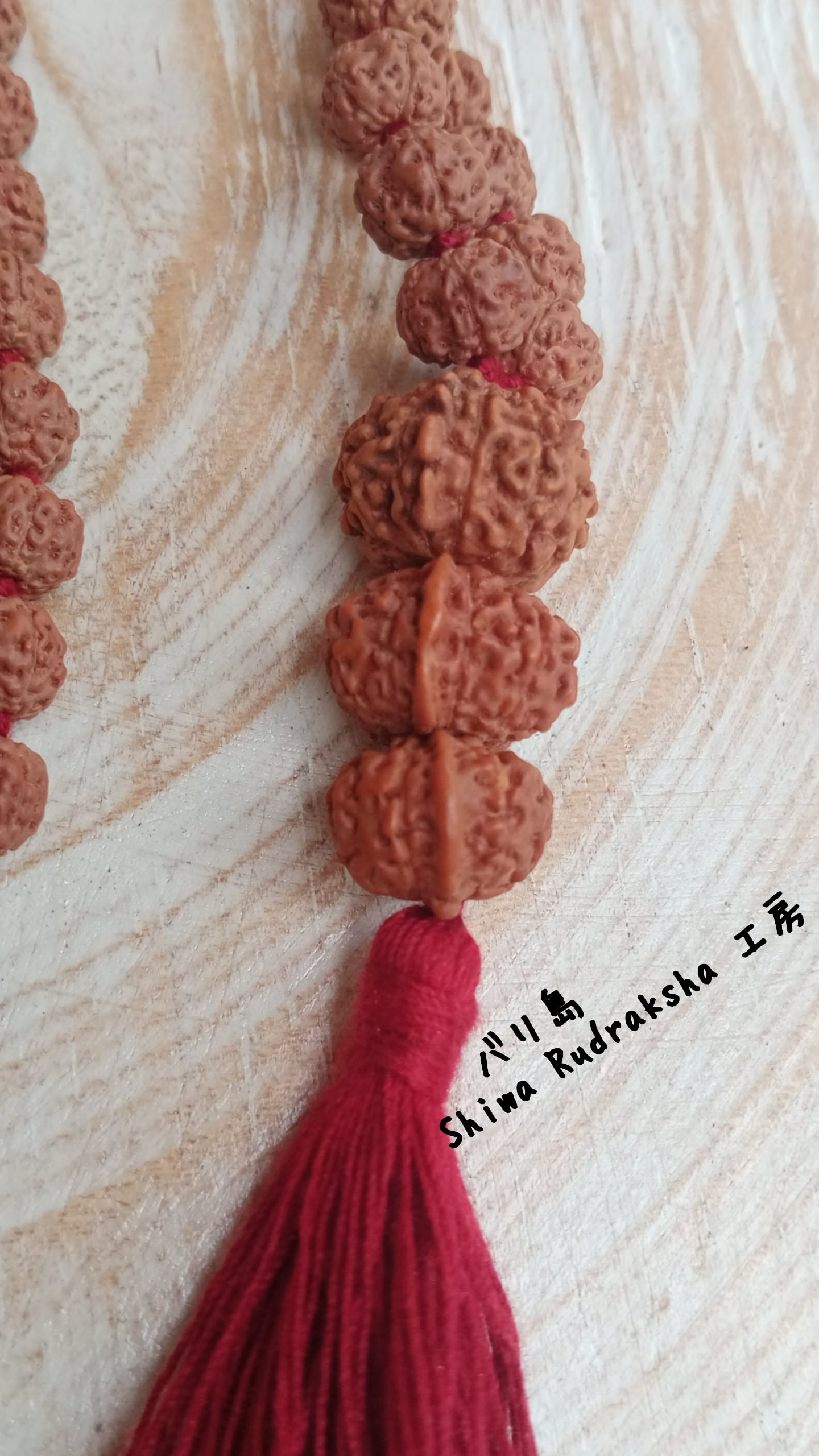 グルビーズに、ルドラクシャ8面(ガネーシャ)と、9面(ドゥルガー女神)に、10面(ヴィシュヌ)を3段にして組み入れたオールルドラクシャの108粒マーラーです。