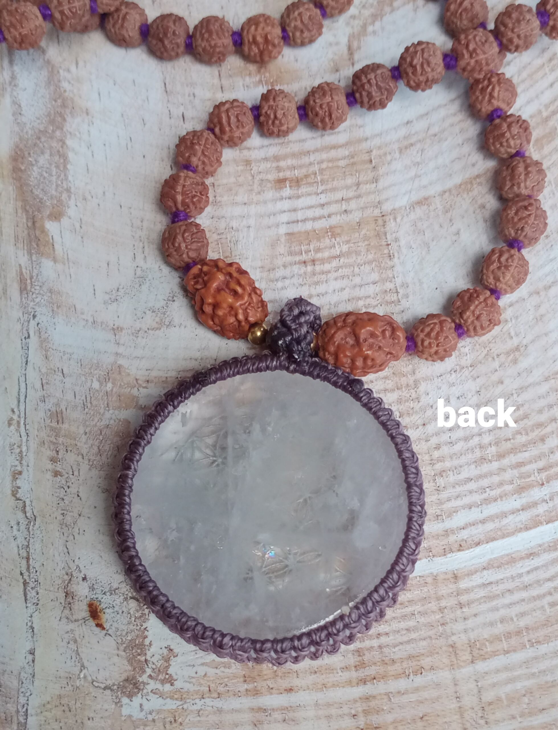 「フラワーオブライフ」の彫刻入りのパワーストーン「クリスタル水晶」をマクラメ加工のペンダントトップにした108粒マーラーです。