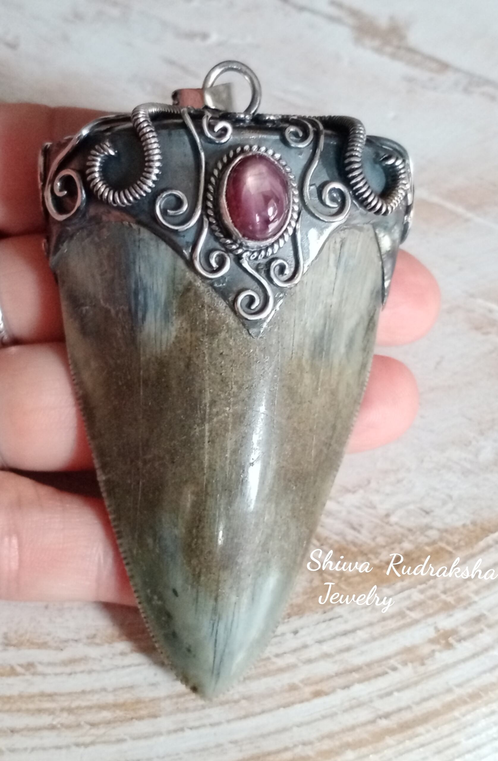約300万年前のものと思われる「ホホジロザメ」の歯の化石を、ゴージャスなペンダントトップにしました。