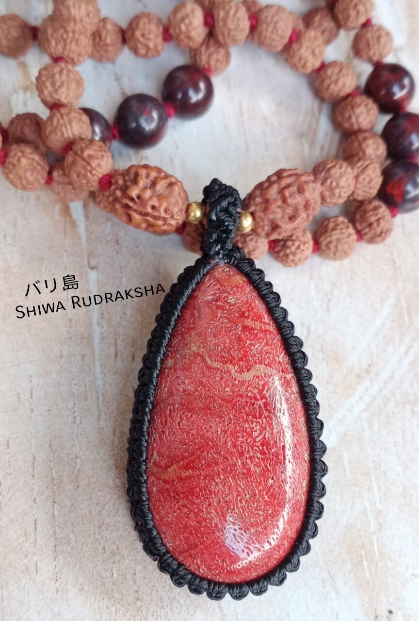 ルドラクシャは、「カルマを焼き尽くし、ヒンドゥー三大神が内在する」と言われる「3面(アグニ)」のルドラクシャを「赤珊瑚」の左右に組み入れ、それ以外は5面ルドラクシャ(ルドラ)です。