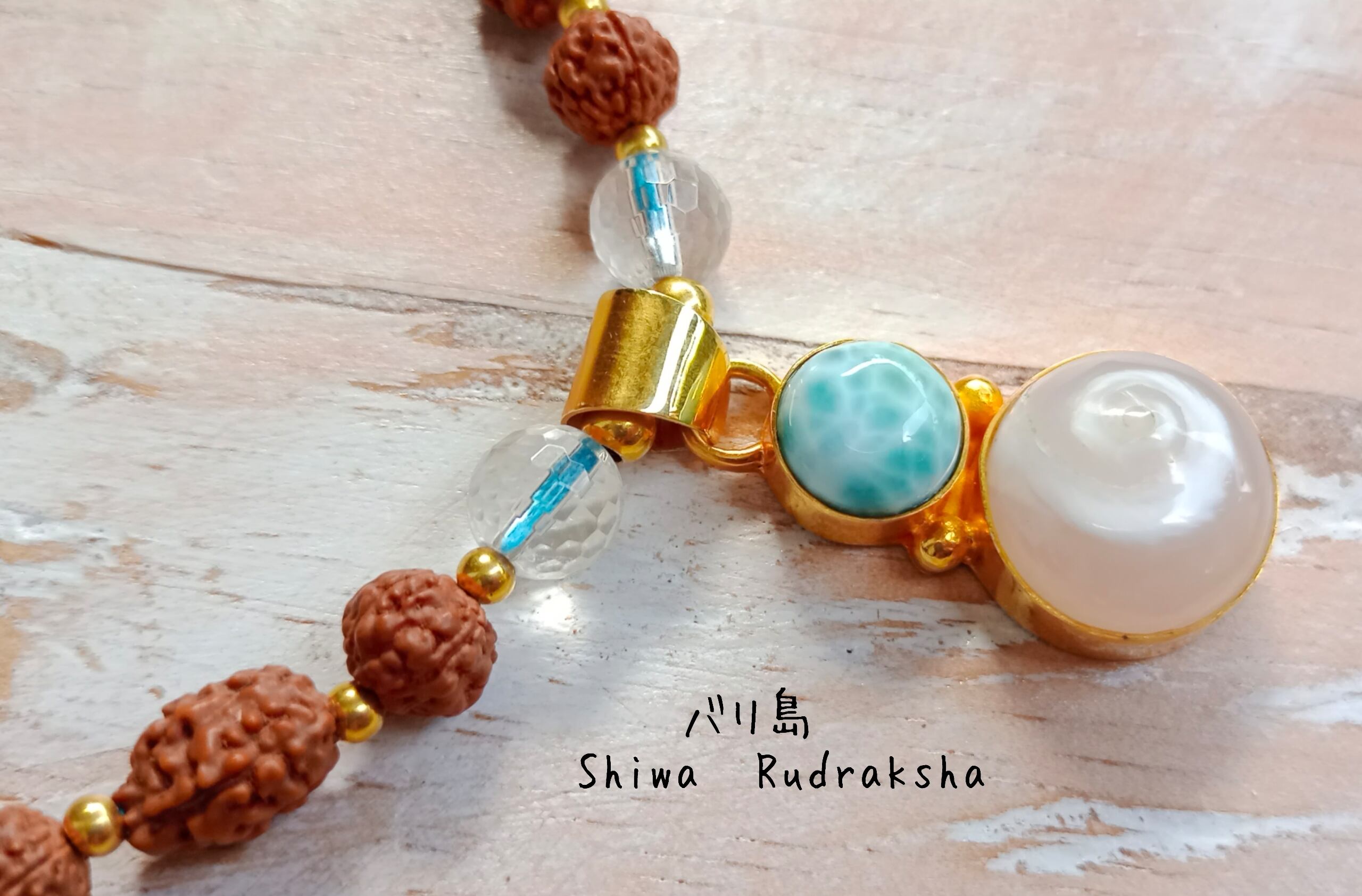 特注の「ケオン&ラリマー装飾」のペンダントトップに、ルドラクシャ3面入りのノット(結び)タイプのネックレスです。