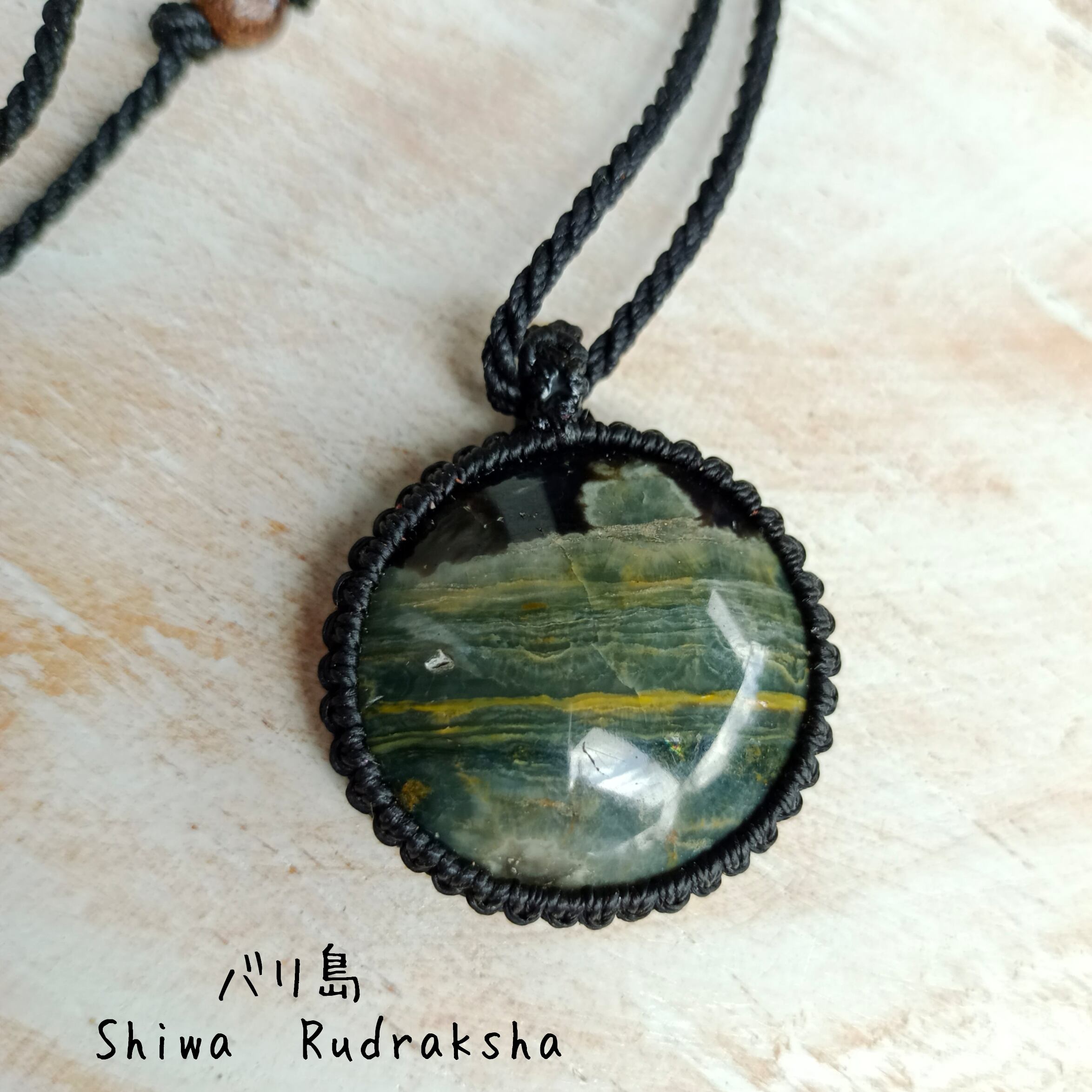 「オーシャンジャスパー」をマクラメ加工のペンダントトップにした紐ネックレスです。