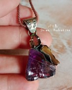 シンプルなマクラメの紐ネックレスのストッパー部分には「幸福と繫栄・土星の悪影響を緩和する。」と言われるルドラクシャ「7面ラクシュミー女神」を組み入れています。