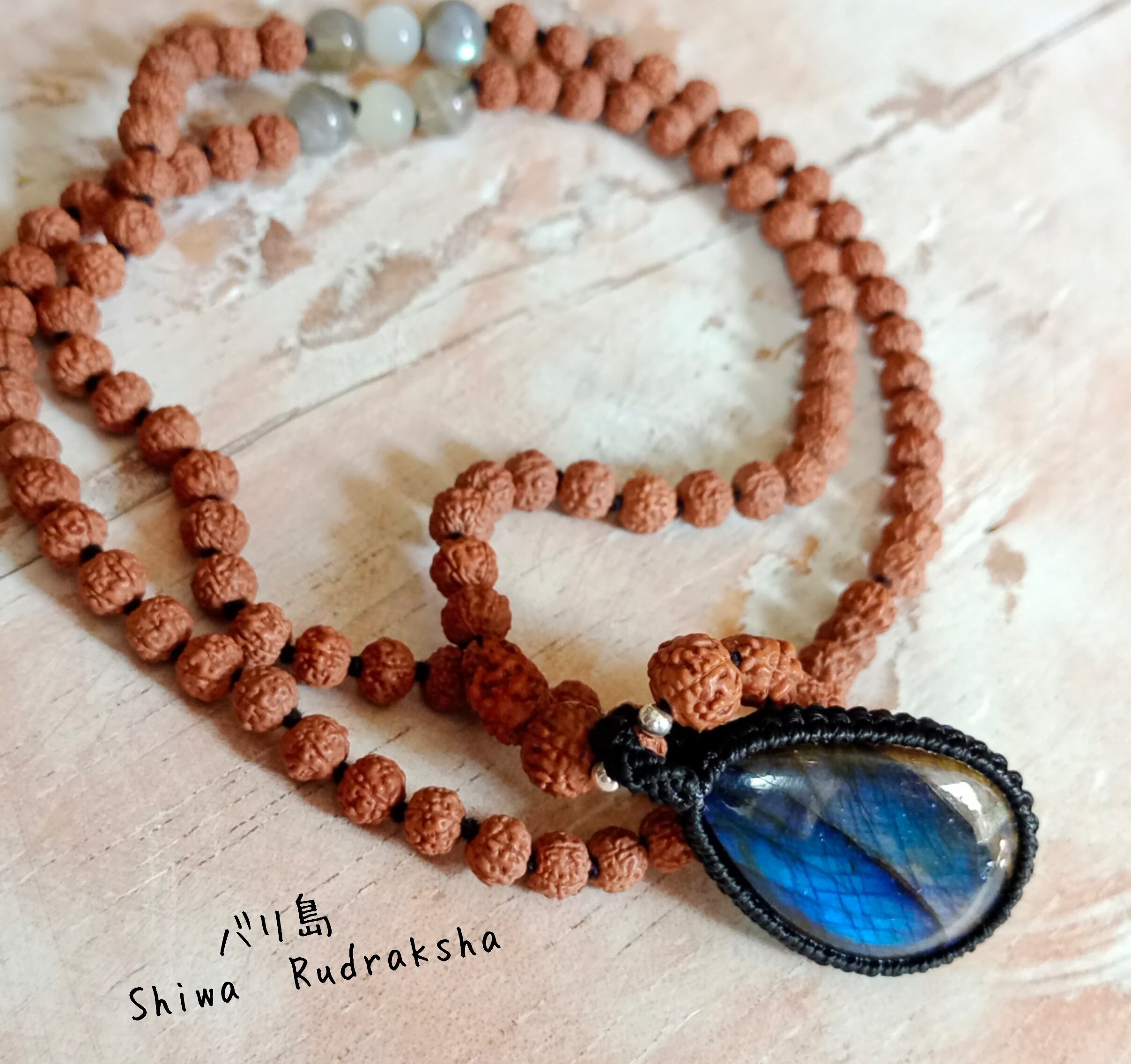 「幸福と繫栄・人間関係を円滑にする」と言われる組み合わせである、ルドラクシャ「2面&7面」も、マクラメ加工した「ラブラドライト」の左右に組み入れました。