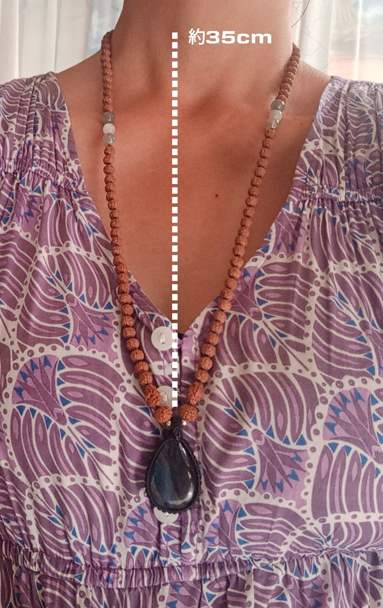 ★ガウリィシャンカラ(約14mm)・ルドラクシャ5面(約6mm)・ルドラクシャ2面(約縦11mm)・ルドラクシャ7面(約9mm)・ラブラドライト(約8mm)・グレームーンストーン(約7mm)・ラブラドライトペンダントトップ(約36mm×約26mm)