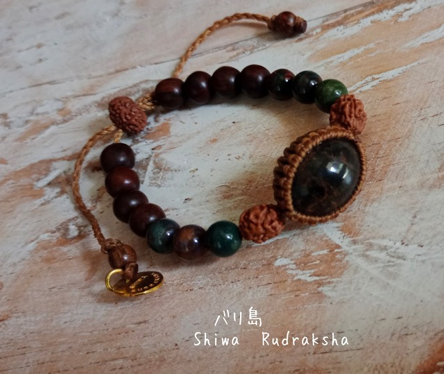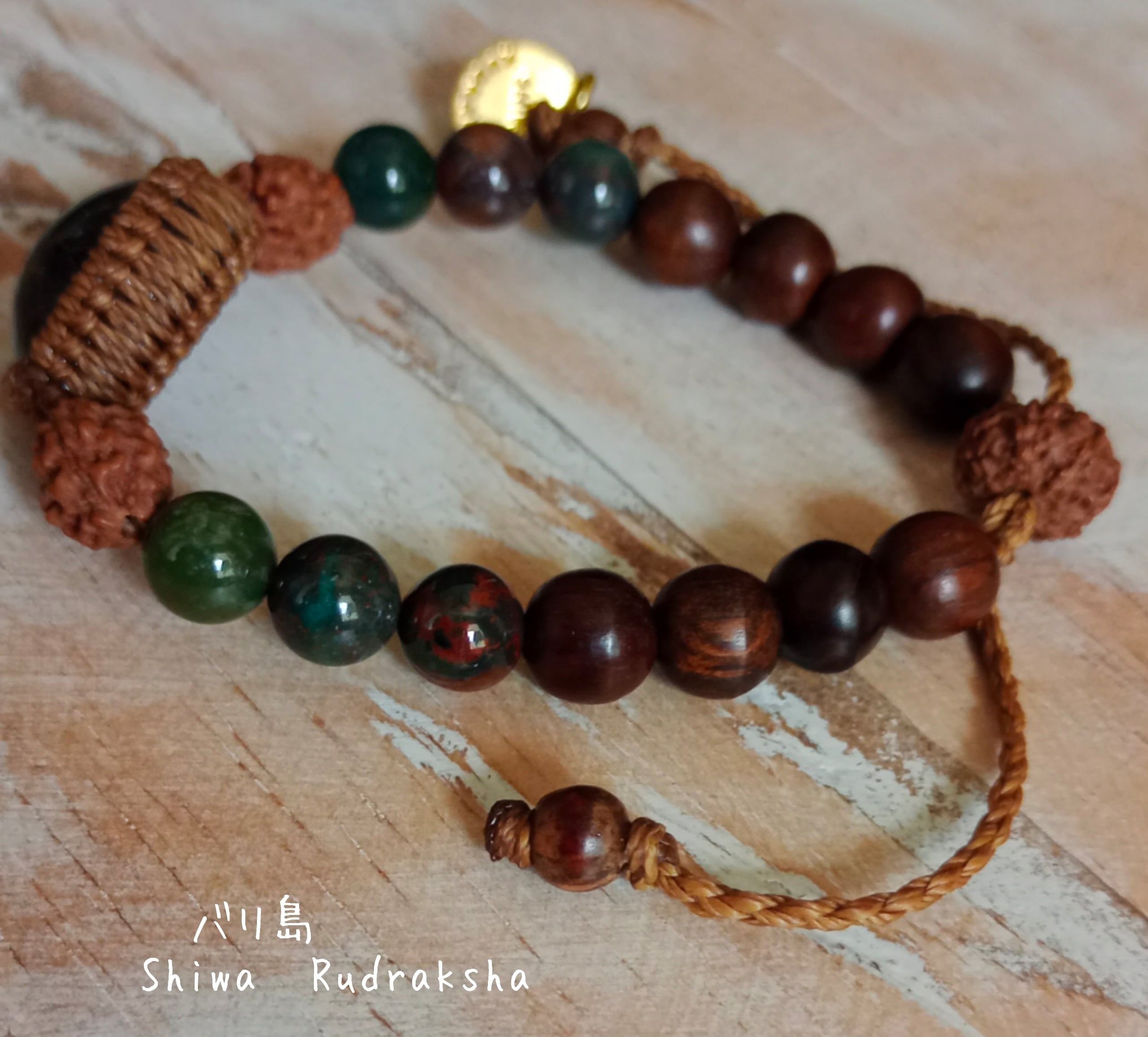★ルドラクシャ3面(約縦11mm) ・ルドラクシャ8面(約11mm)・ブラッドストーン(約8mm)・カリマンタン産ガハル(沈香)ウッドビーズ(約9mm)・プラキストーン(約24mm×約18mm)