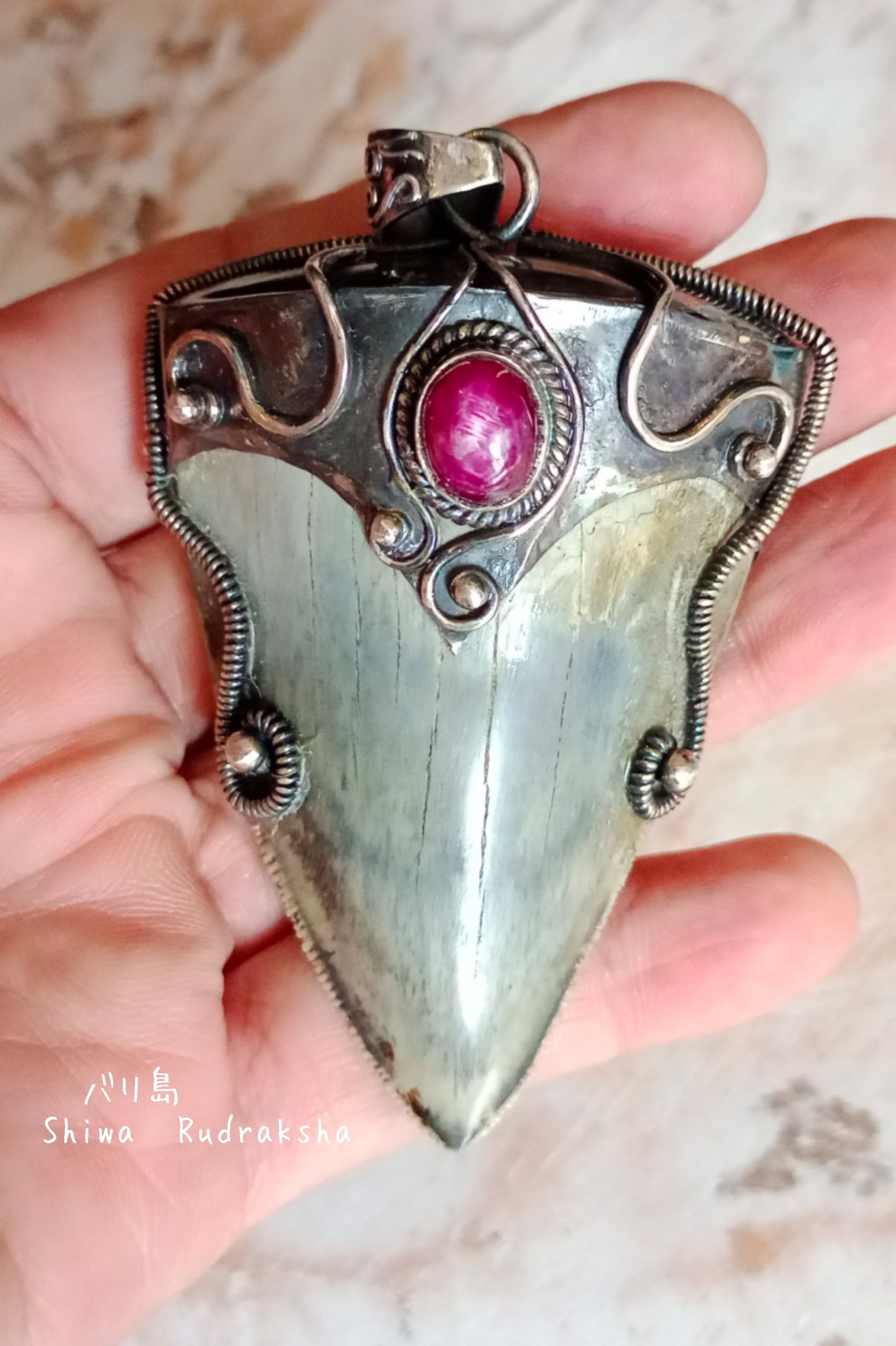 約300万年前のものと思われる「ホホジロザメ」の歯の化石を、ゴージャスなペンダントトップにしました。