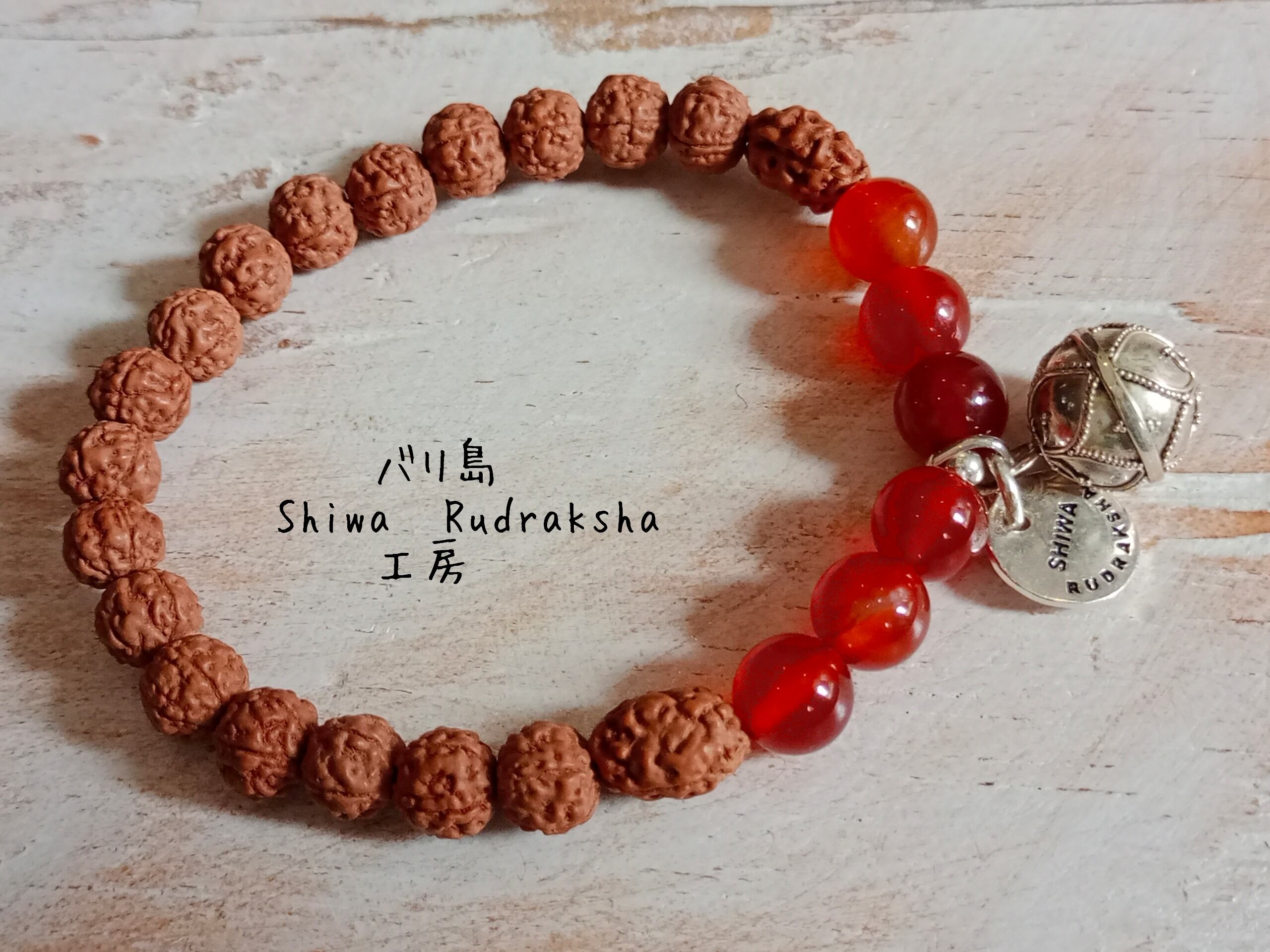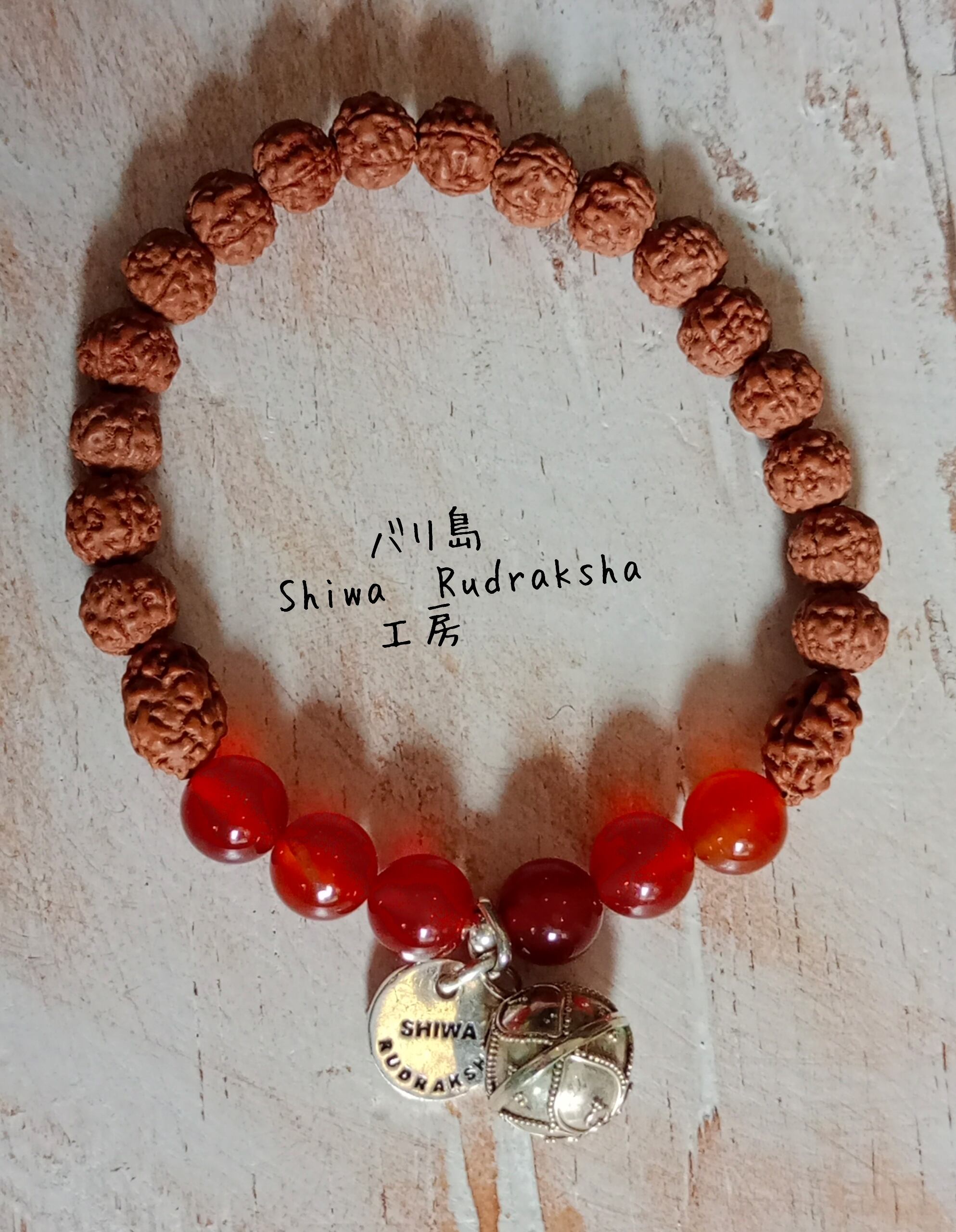 「カーネリアン」の間にガムランボールを挟み、左右に「ルドラクシャ2面シヴァ&パールヴァティ」と「ルドラクシャ3面アグニ」組み入れた可愛いブレスレットです。
