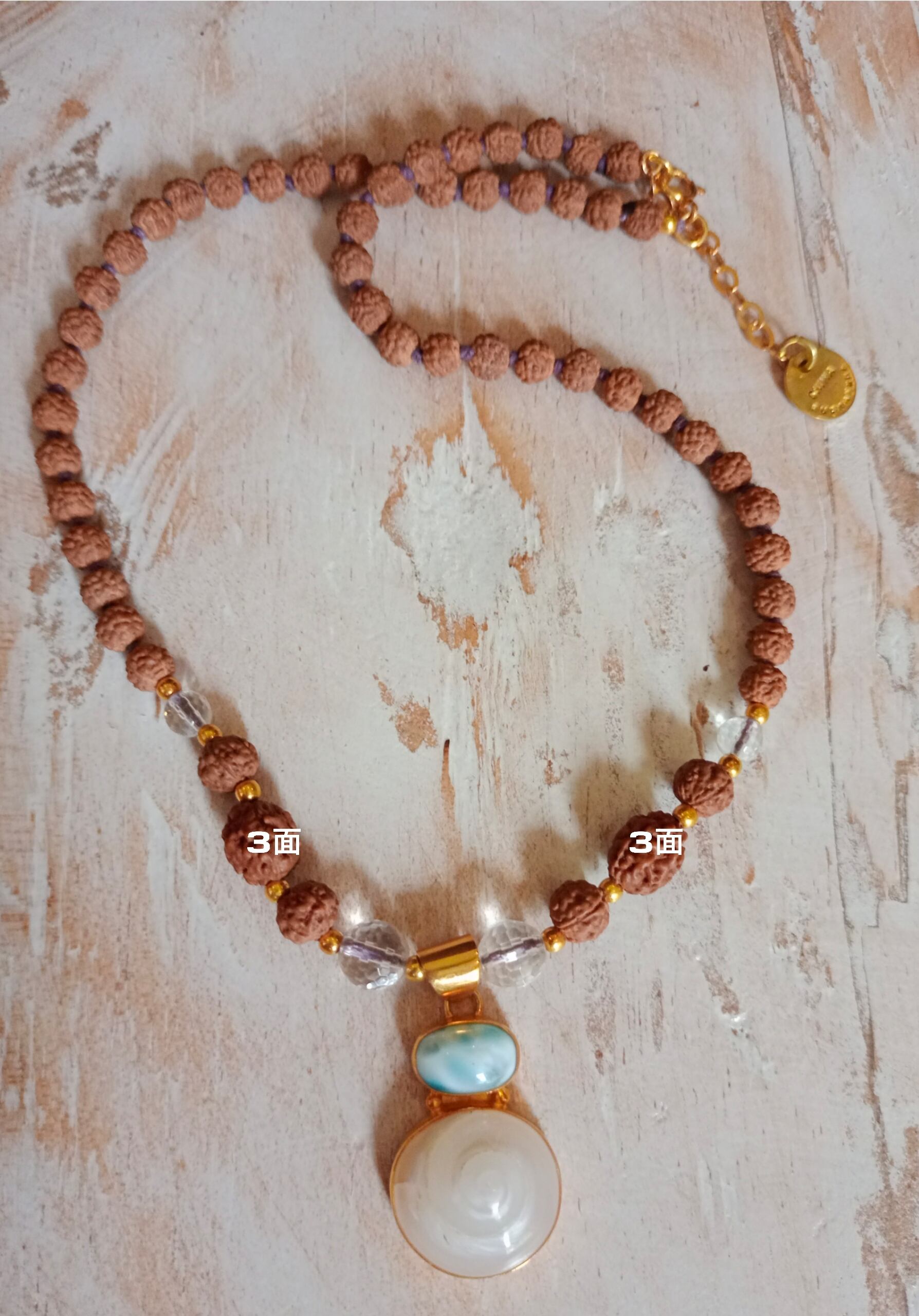 「ヒンドゥー三大神が内在する」と言われる「3面アグニ」を、5面ルドラクシャで挟み、カッティングクリスタル水晶をネックレス部分に使用しています。