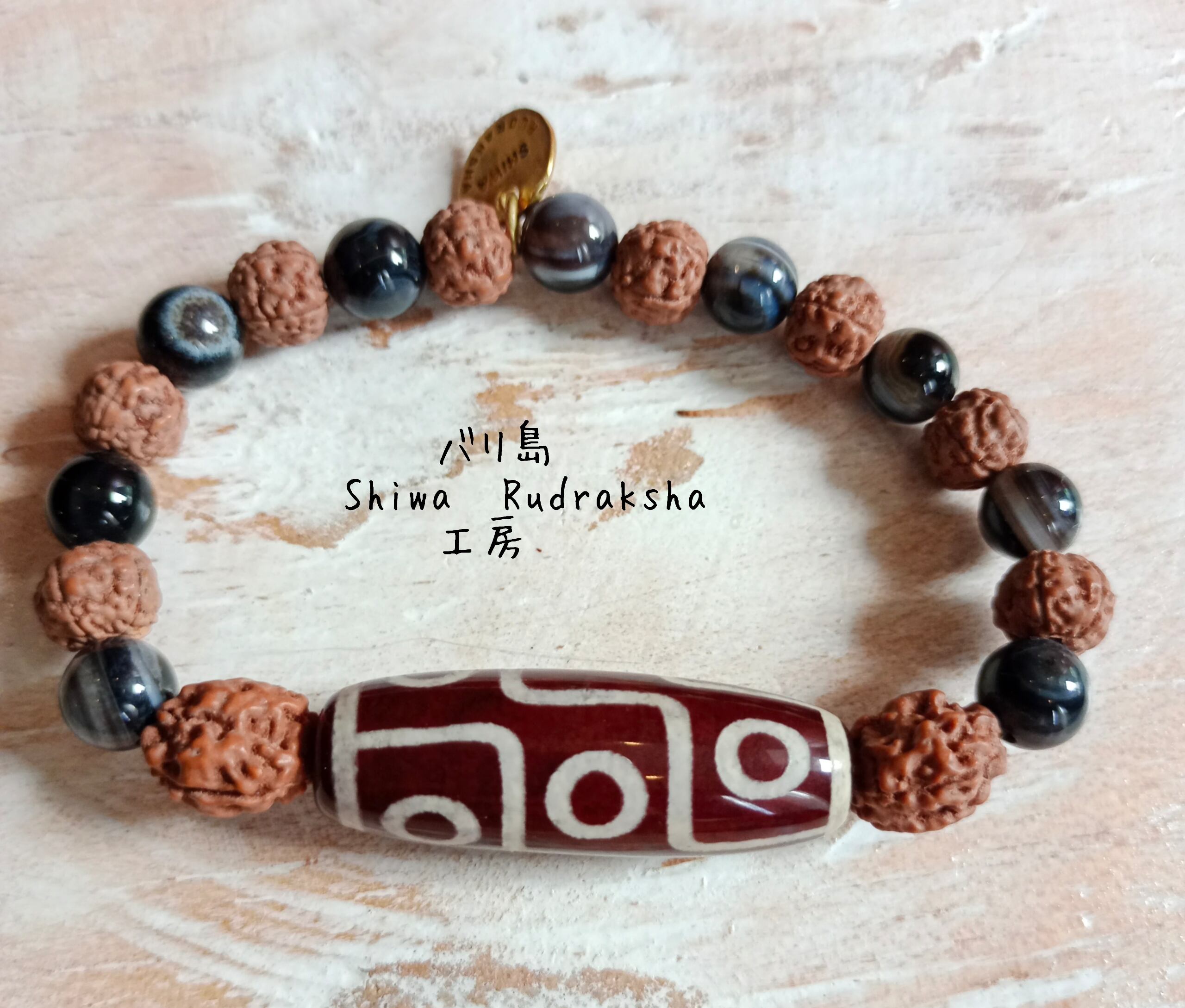 ★ルドラクシャ5面(約8mm)・ルドラクシャ3面(約縦11mm)・天眼石アゲート瑪瑙(約8mm)・九眼天珠(約39mm)