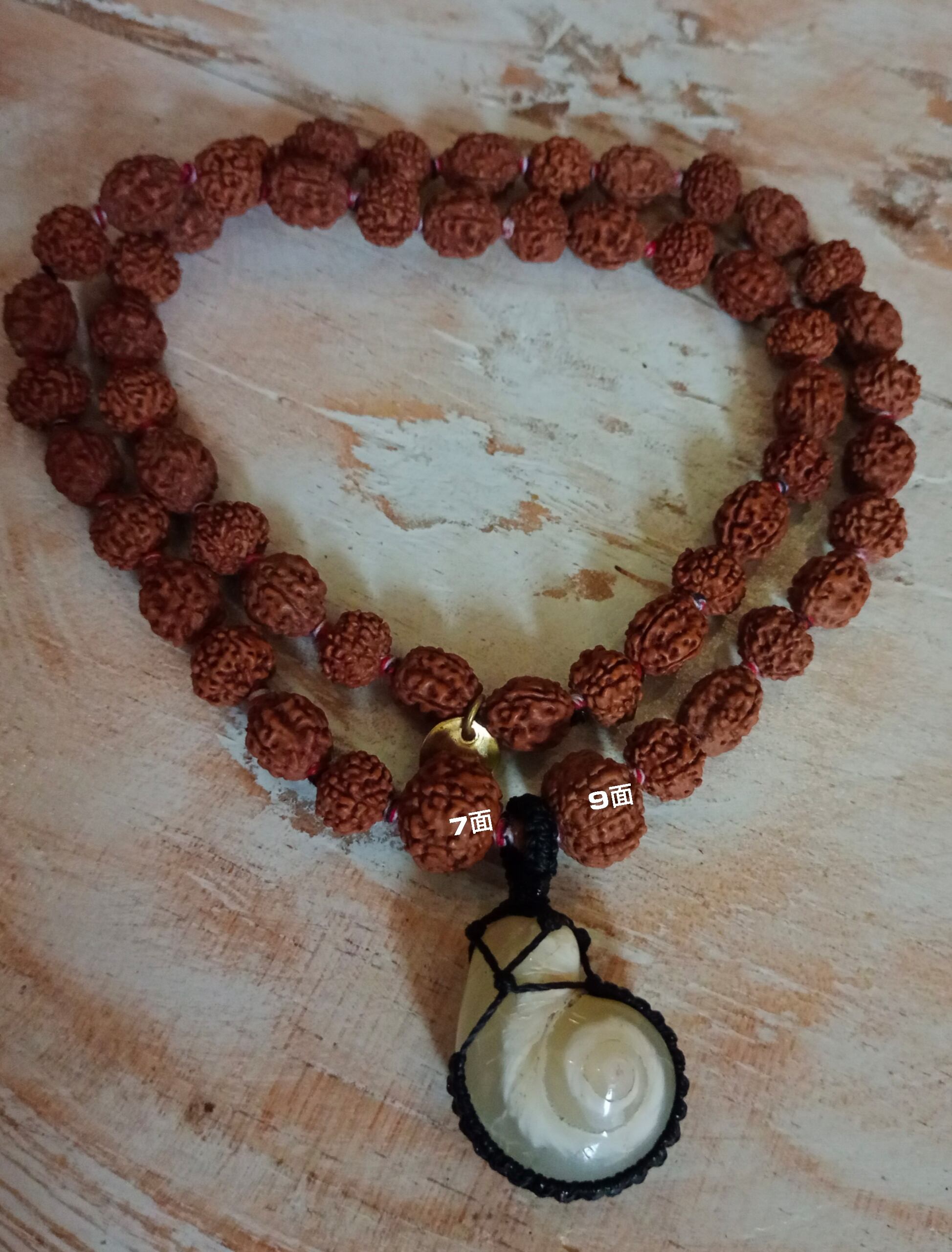 「幸福と繁栄」の7面ルドラクシャ「ラクシュミー女神」と9面ルドラクシャ「ドゥルガー女神」を「ケオン」の左右に取り付け、「学問や芸術の神様」をあらわす4面&6面ルドラクシャ「サラスヴァティ女神」をマーラー部分に交互に組み入れました。