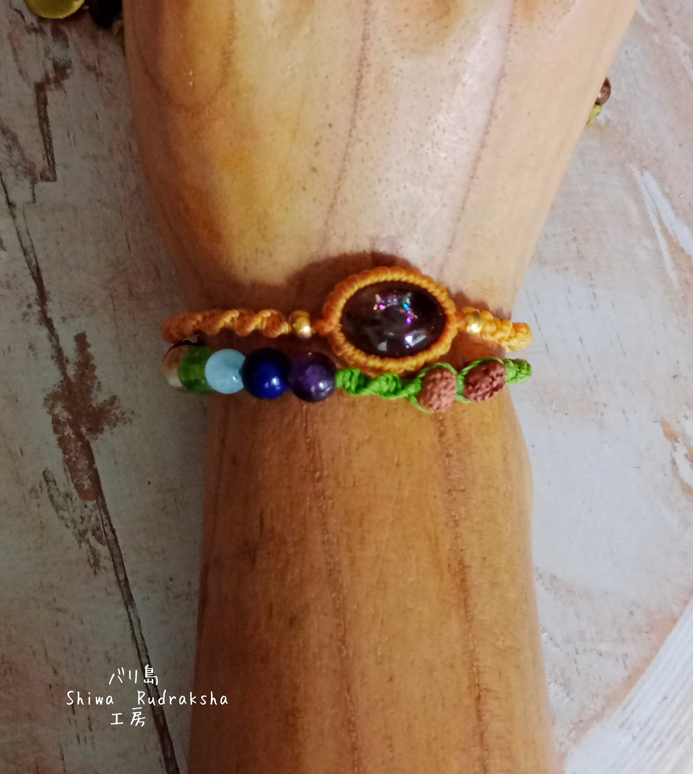 インドネシア産の「レインボースモーキークォーツ」と、チャクラカラーの天然石をマクラメ加工したスレッドタイプの2連ブレスレットです。