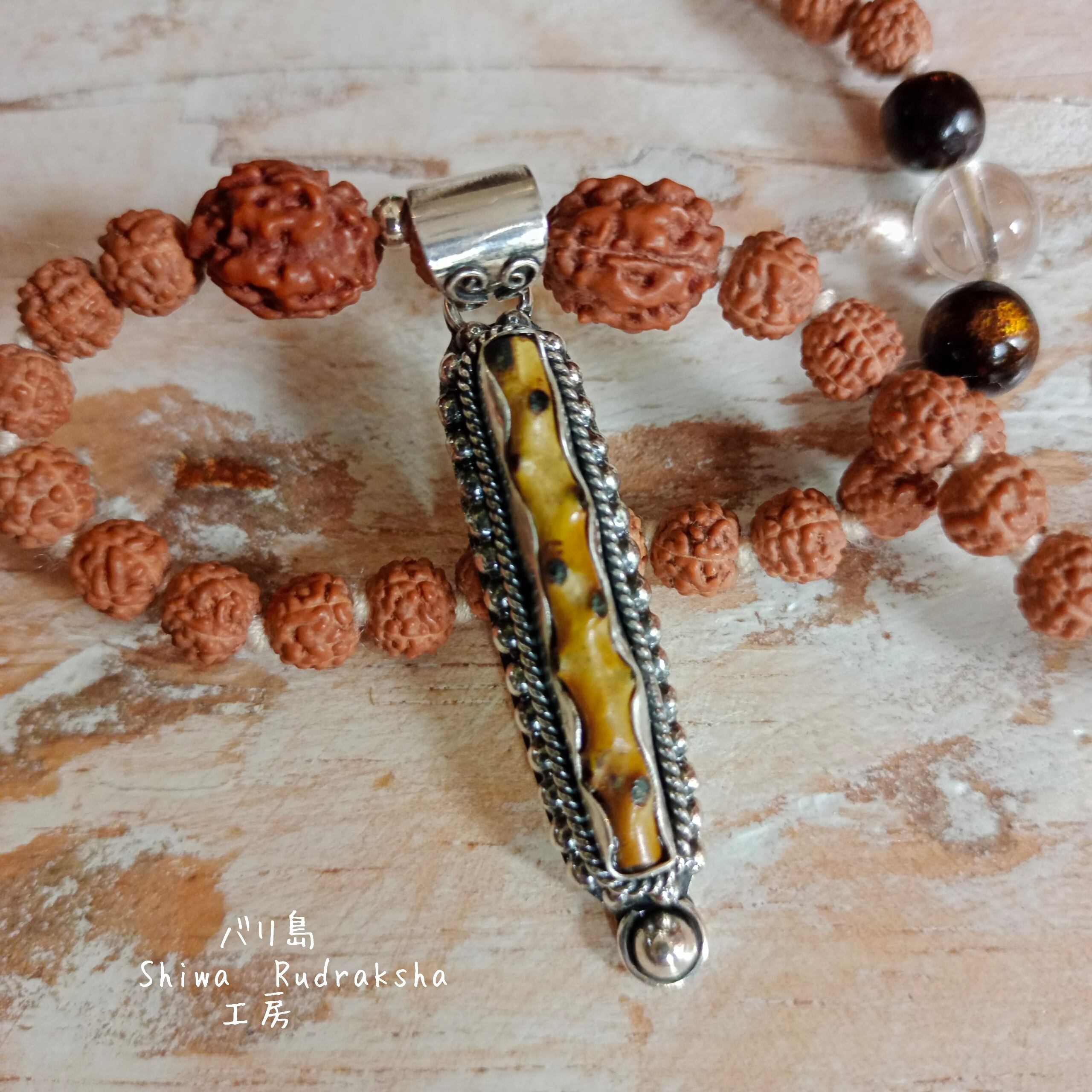 インドネシア産「ゴールドウリ」の中でもレアな珊瑚「スートラウマス・チェマラ」の原木サンゴをペンダントトップにしたルドラクシャネックレスです。