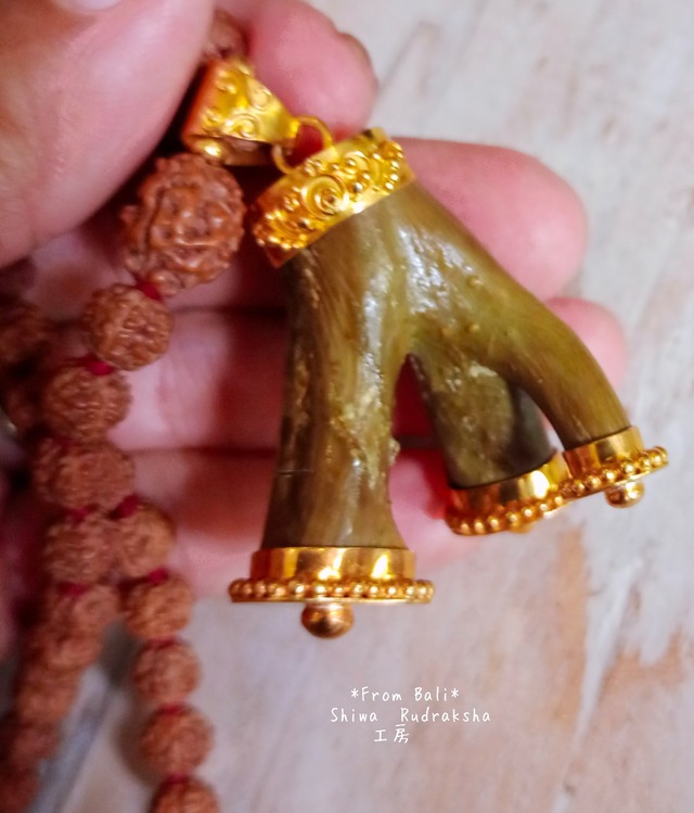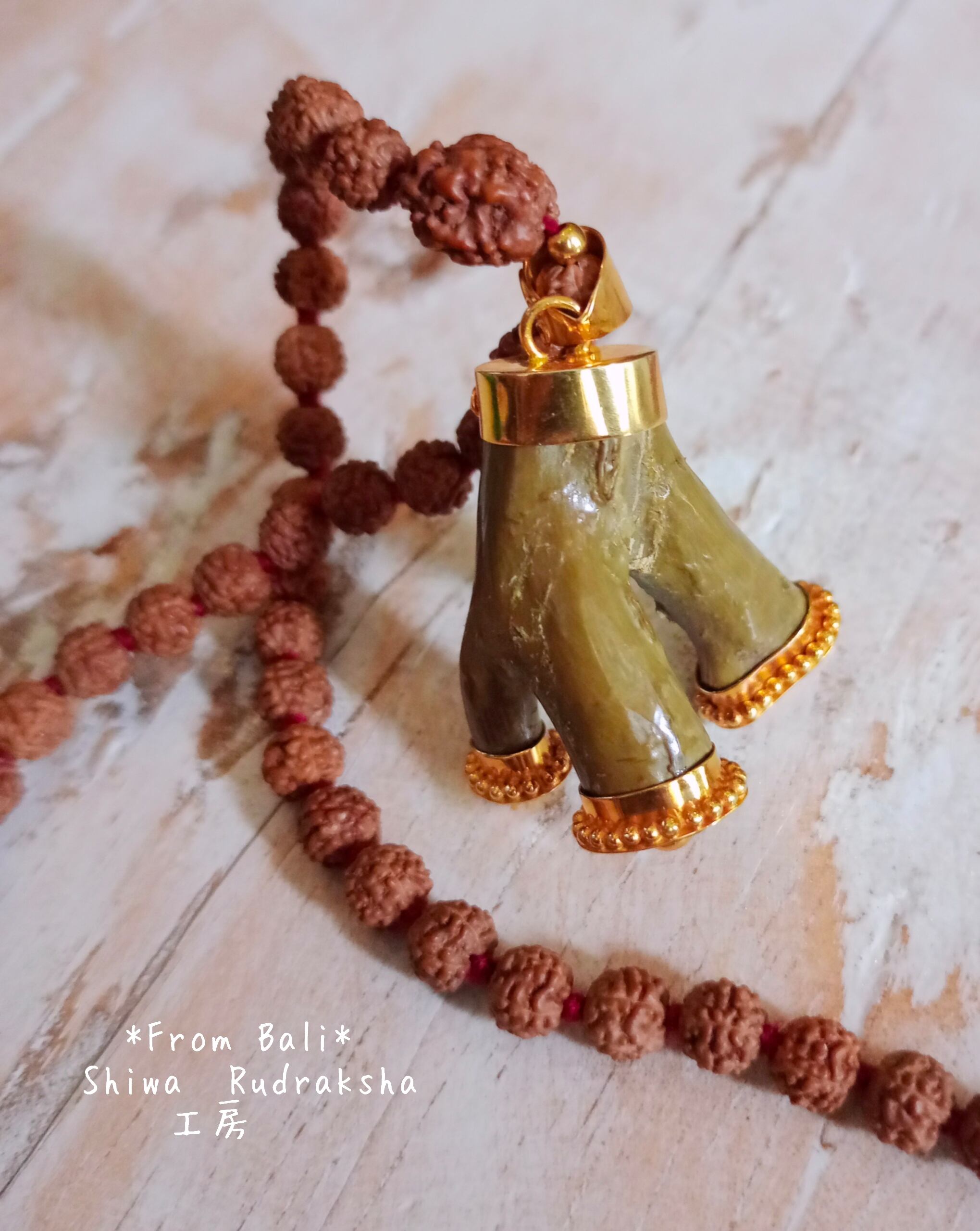 ルドラクシャは「ヒンドゥー三大神」が内在すると言われる「3面アグニ」を「グリーンウリ・インドネシア産」の左右に組み入れ、それ以外は「周りに神聖な波動を与える」と言われるルドラクシャ5面(ルドラ)です。
