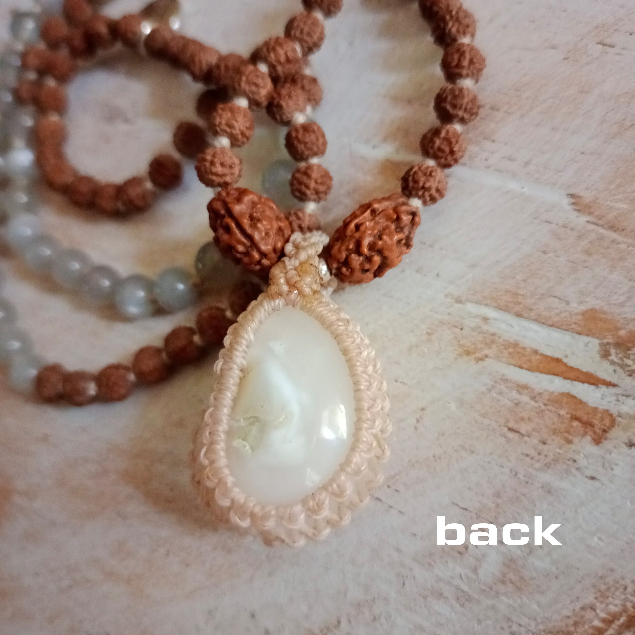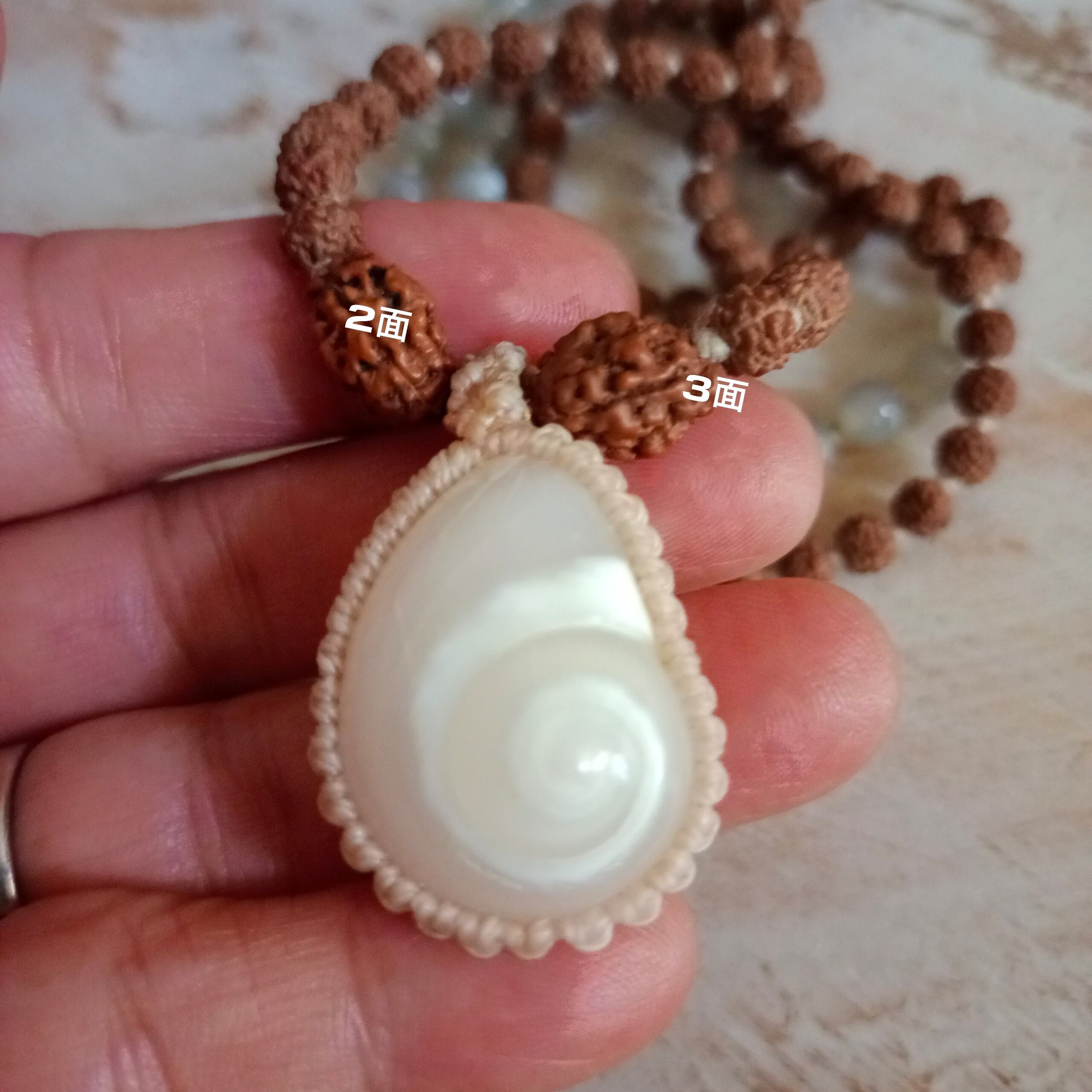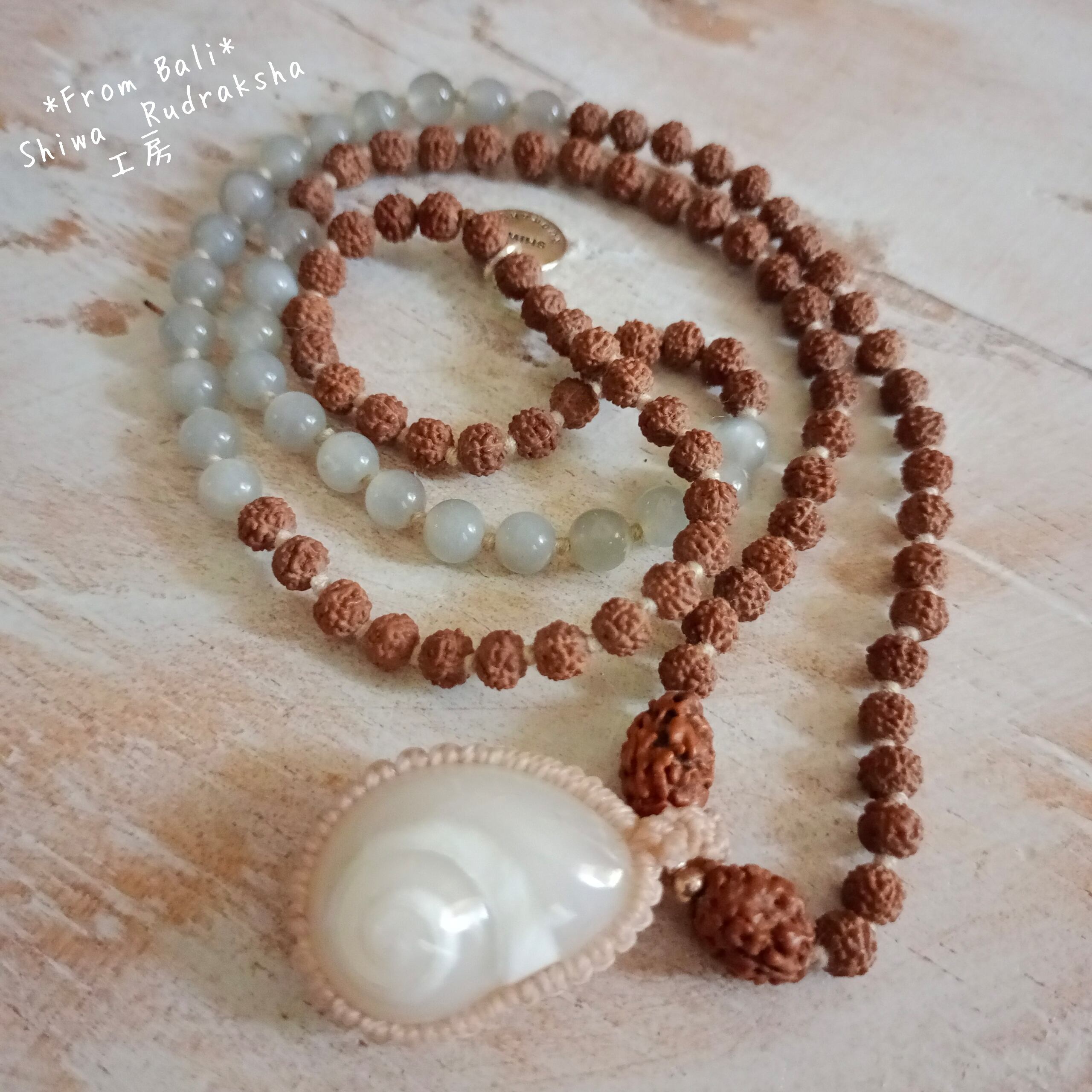 渦巻の真ん中が飴色の『ケオン』をマクラメ加工して、左右に「2面シヴァ&パールヴァティ」と、「3面アグニ」を付けた108粒マーラーです。