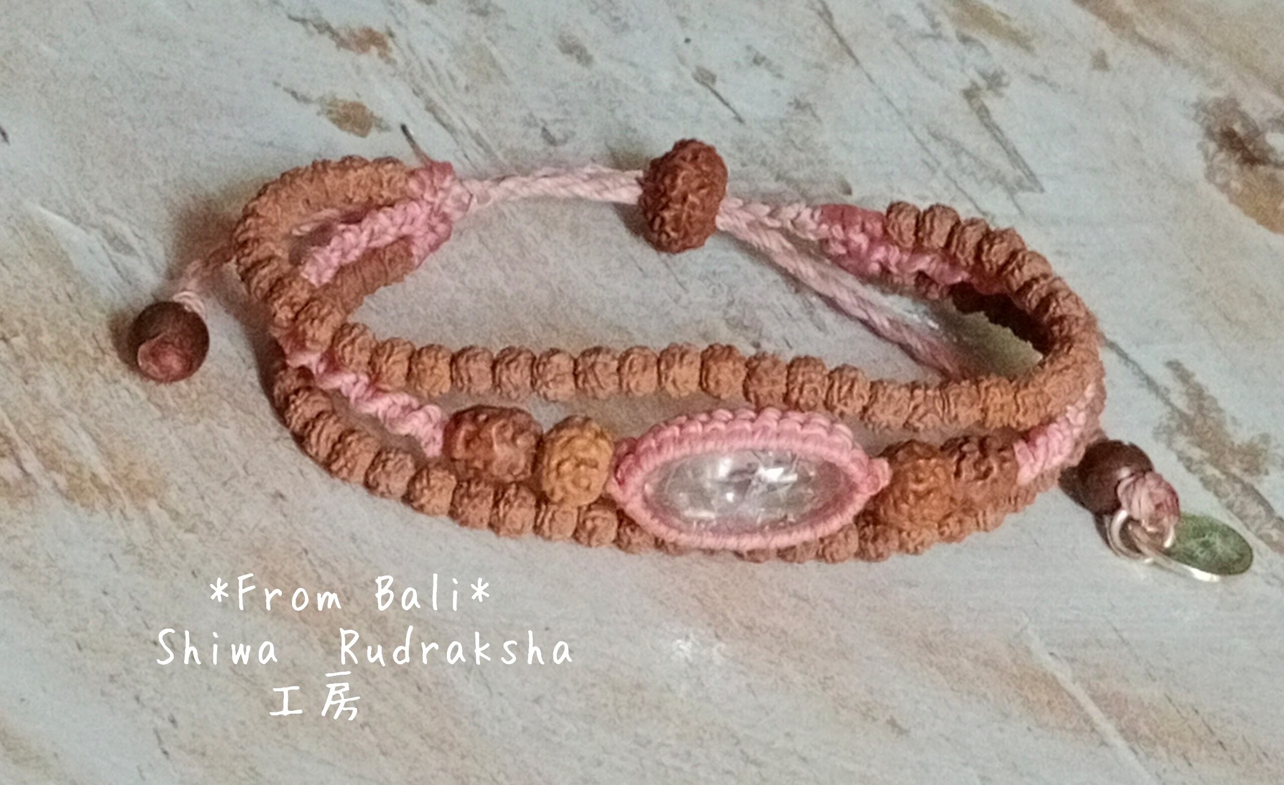 ルドラクシャは、2面(シヴァ&パールヴァティ)&7面(ラクシュミー女神)を、水晶の左右に組み入れて、紐の長さを調整するストッパー部分に8面を組み入れました。