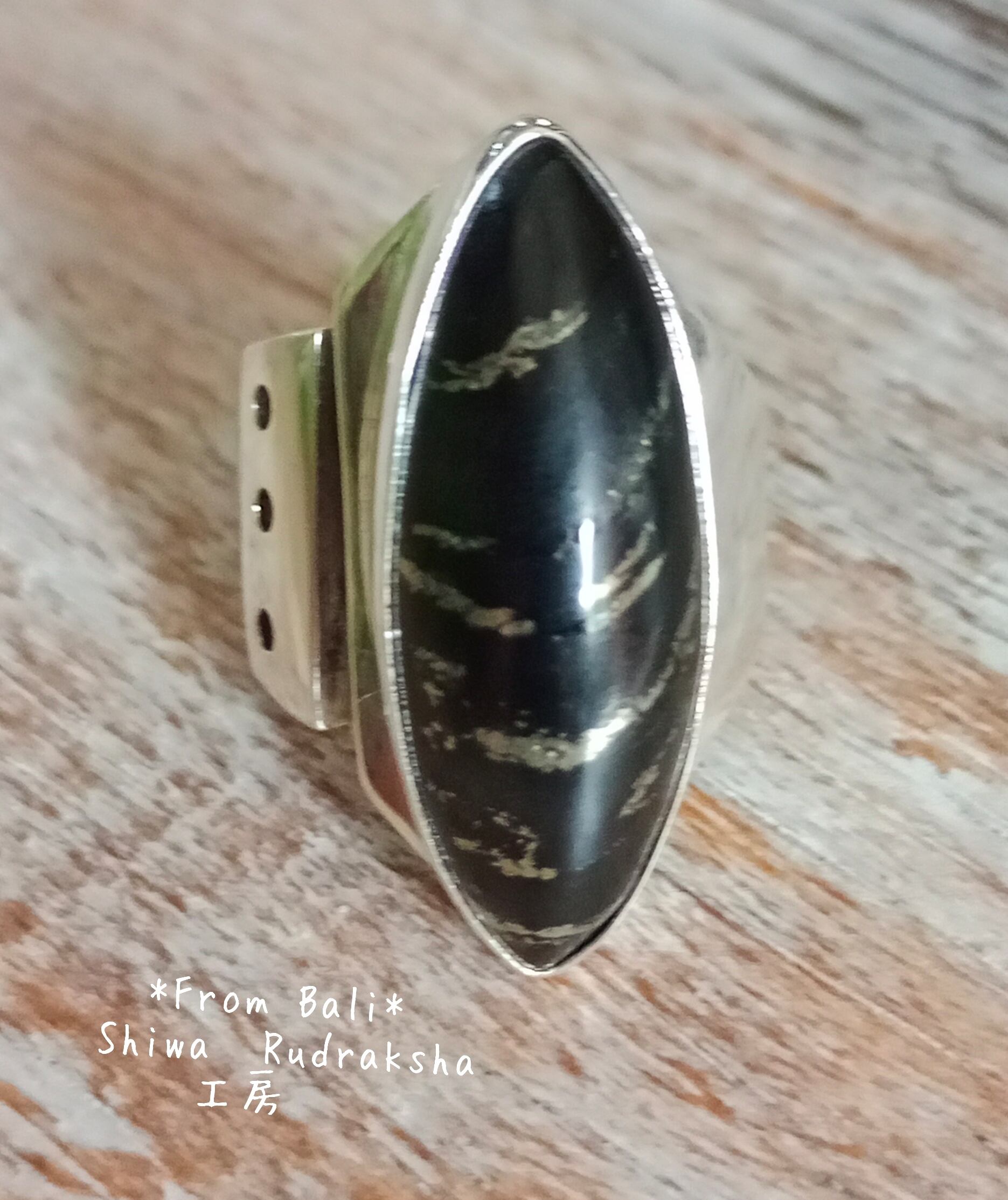 主人のデディがセレクトした「Kelor hitam serat emas」と呼ばれる「モリンガ化石」の原石を研磨して、大粒のシルバーリングにしました。