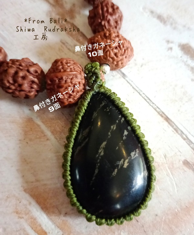 ★ルドラクシャ5面(約12mm)・鼻付きガネーシャ9面(約15mm)・鼻付きガネーシャ10面(約15mm)・アフリカンジャスパー(約10mm)・ケロール ヒタム スラッ ウマス(約38mm×約25mm)