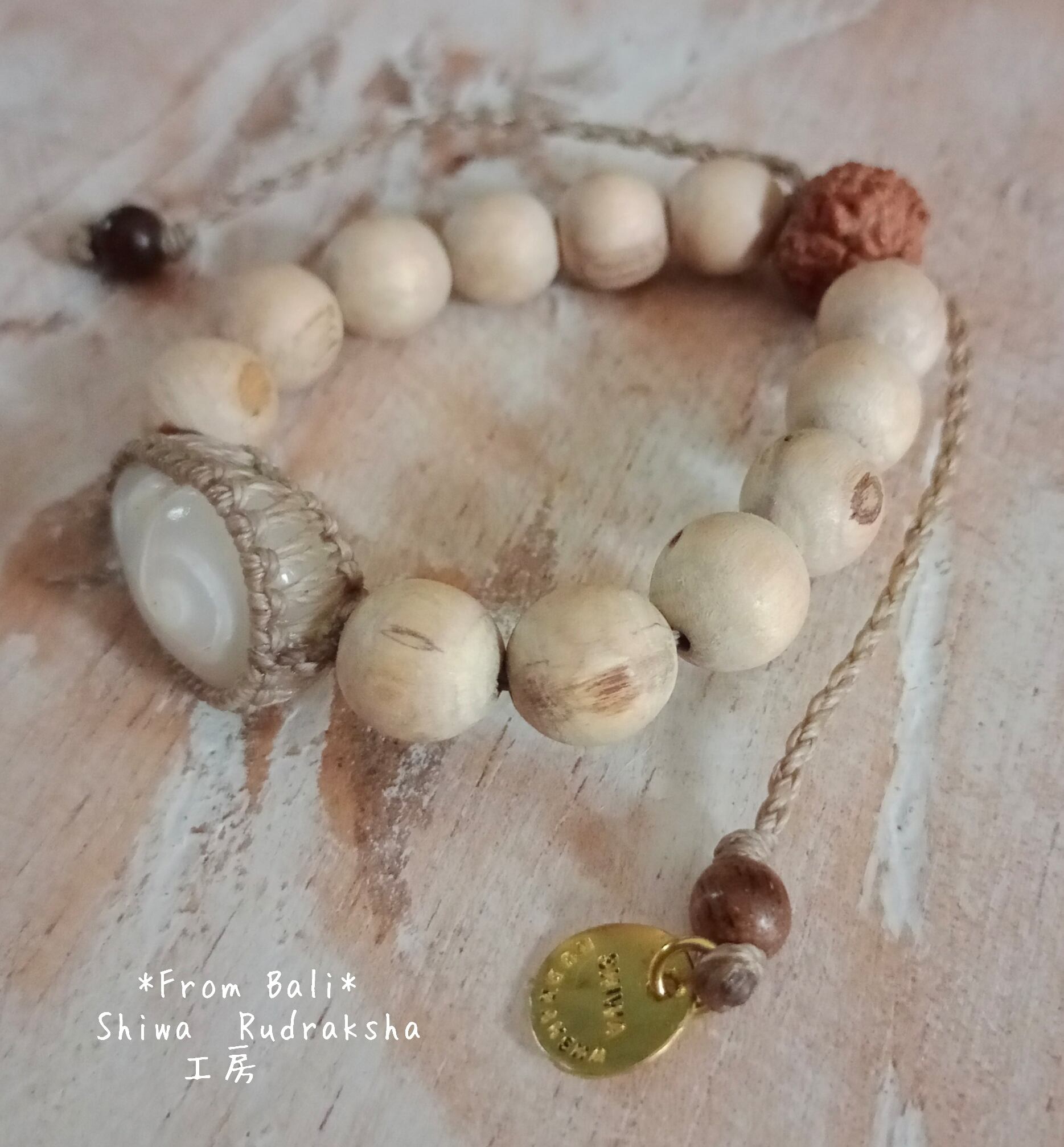 『ケオン』の渦巻き部分をマクラメ加工して、インド産トゥルシービーズで紐ブレスレットを製作しました。