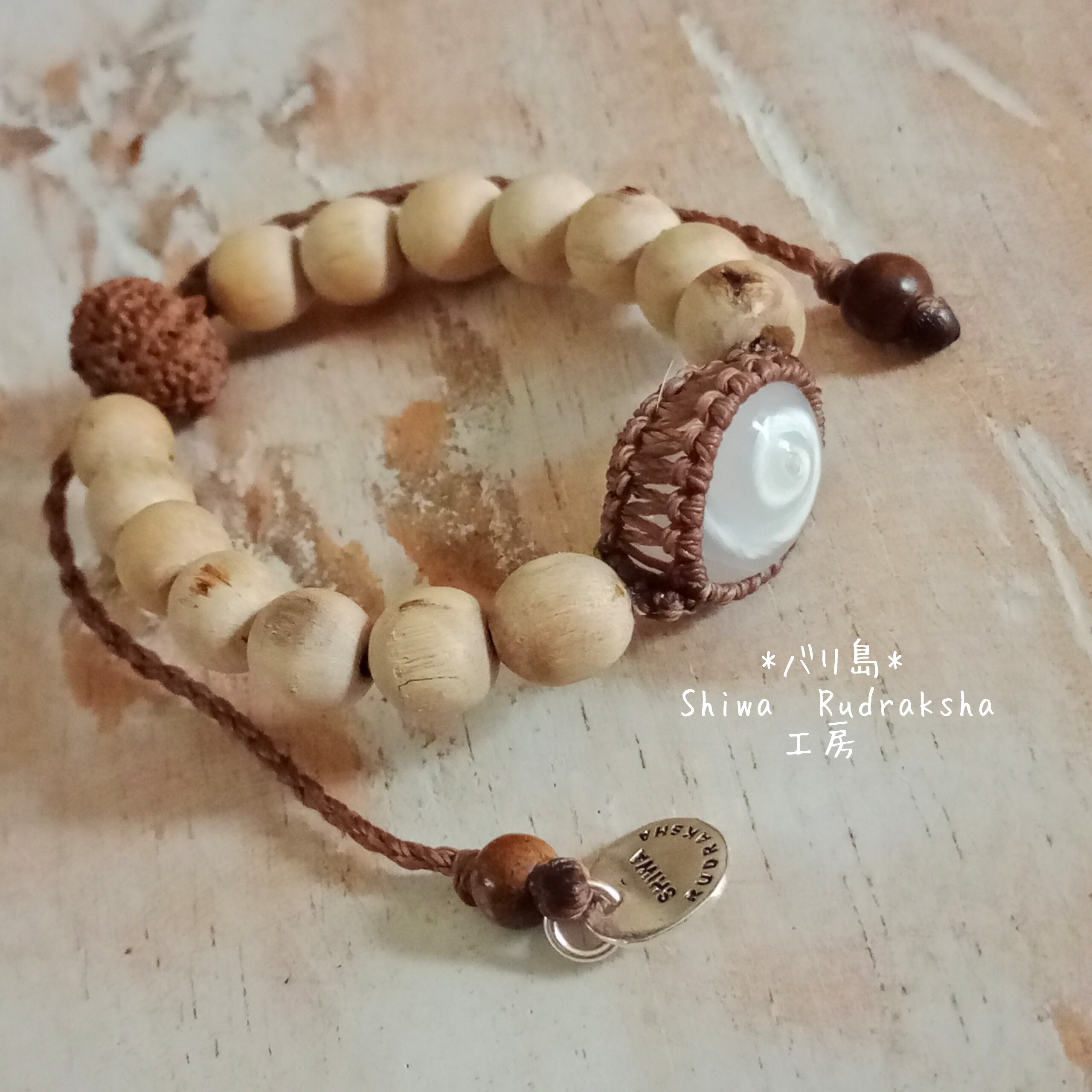『ケオン』の渦巻き部分をマクラメ加工して、インド産トゥルシービーズで紐ブレスレットを製作しました。