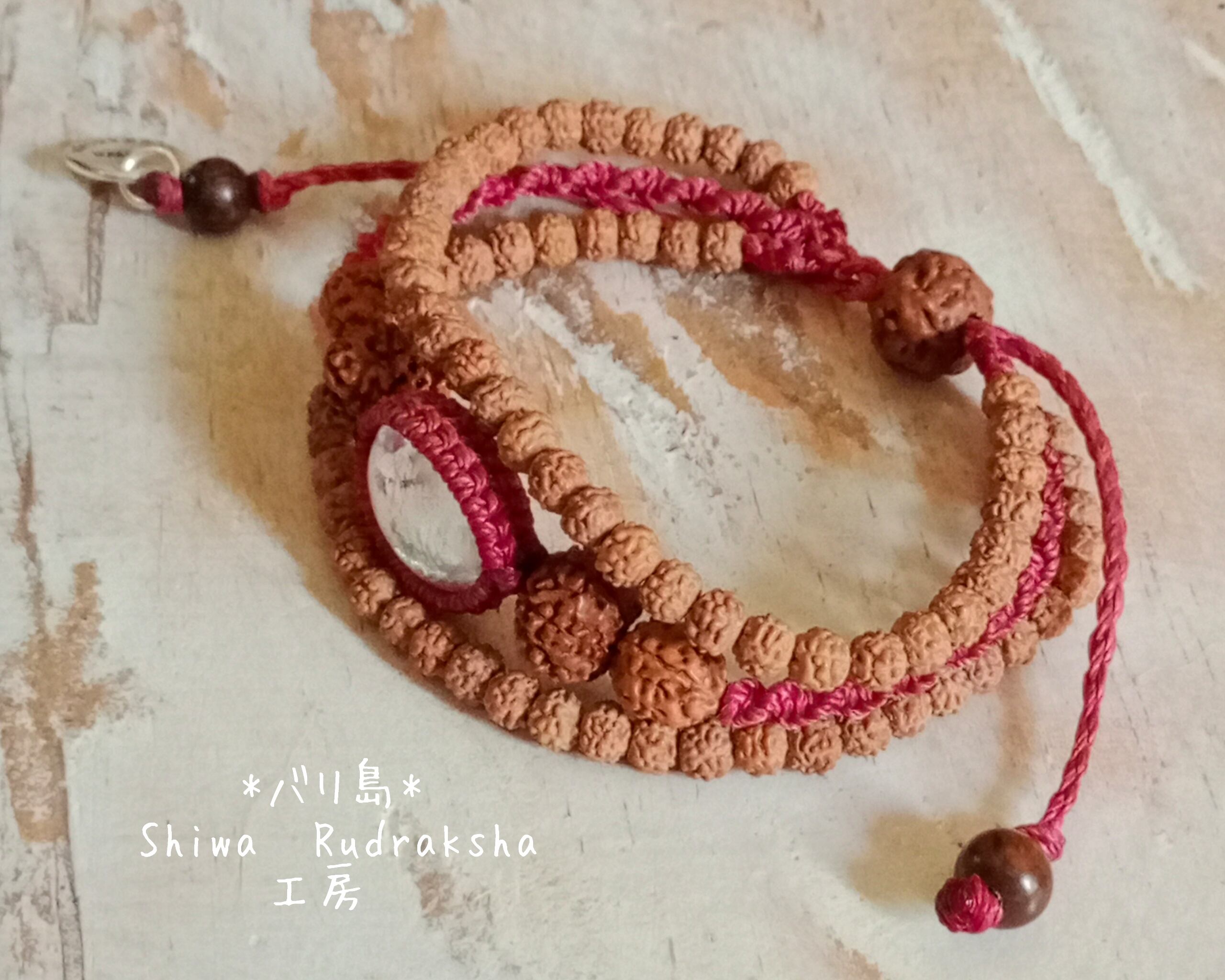ルドラクシャは、「芸術・音楽・学問・愛」の、女神「サラスヴァティ女神」をあらわす4面(ブラフマー)&6面(カルティケヤ)を、水晶の左右に組み入れて、紐の長さを調整するストッパー部分に8面を組み入れました。