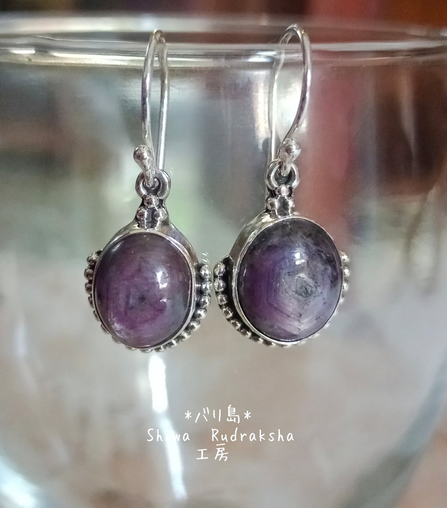 光の加減によって、紫の光を放つ不思議な石「インド産ルビーゴンドラ」のピアスです。