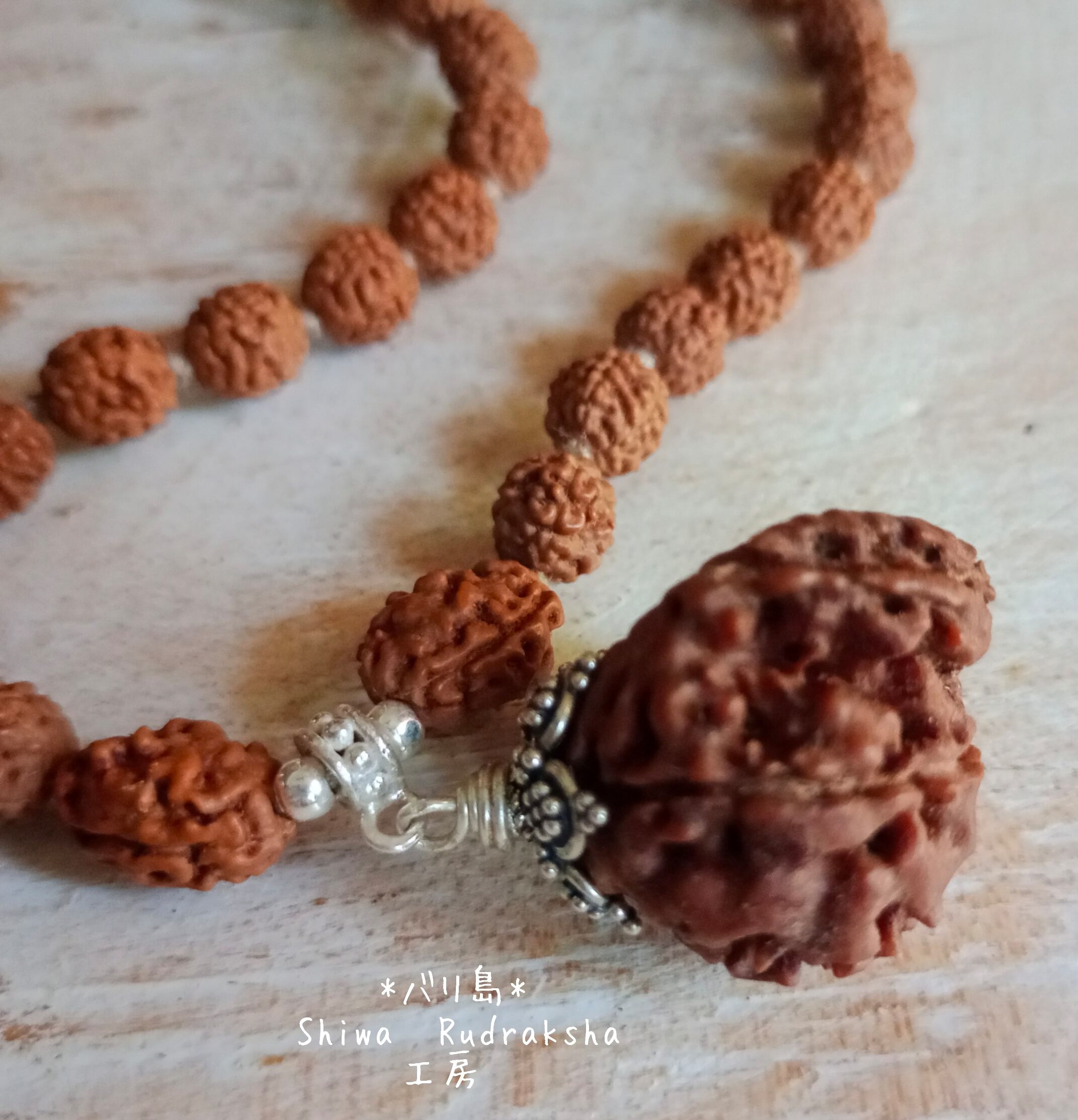 鼻付きガネーシャの中でも、立派な鼻を持つルドラクシャ5面「Savar(サヴァール)」をシルバー925キャップで加工し、マーラーのようにルドラクシャを糸に通して結び目を作るノットタイプにしたネックレスです。
