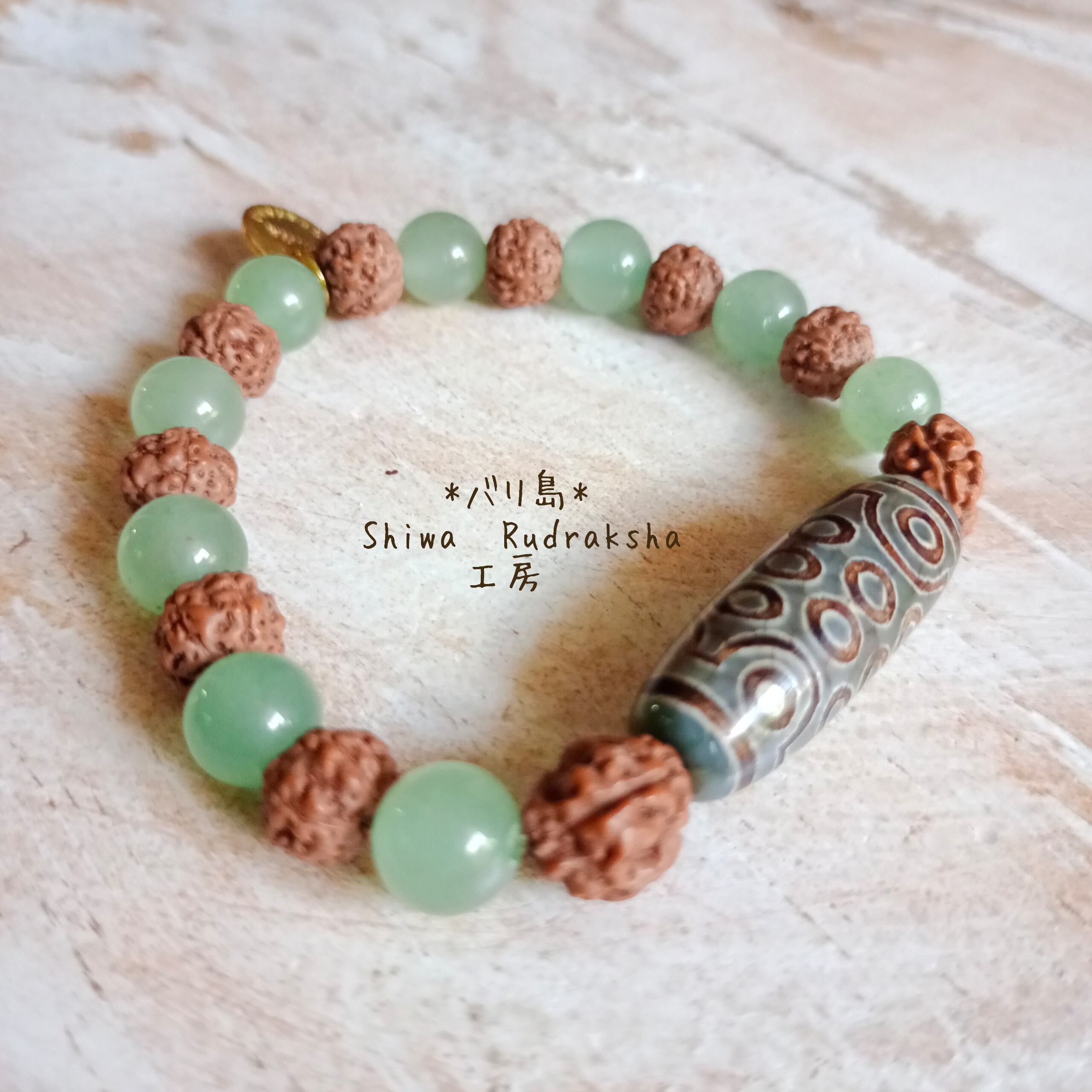 チベットの「天珠」をメインに、ルドラクシャとグリーンアベンチュリンを交互に組み入れたブレスレットです。