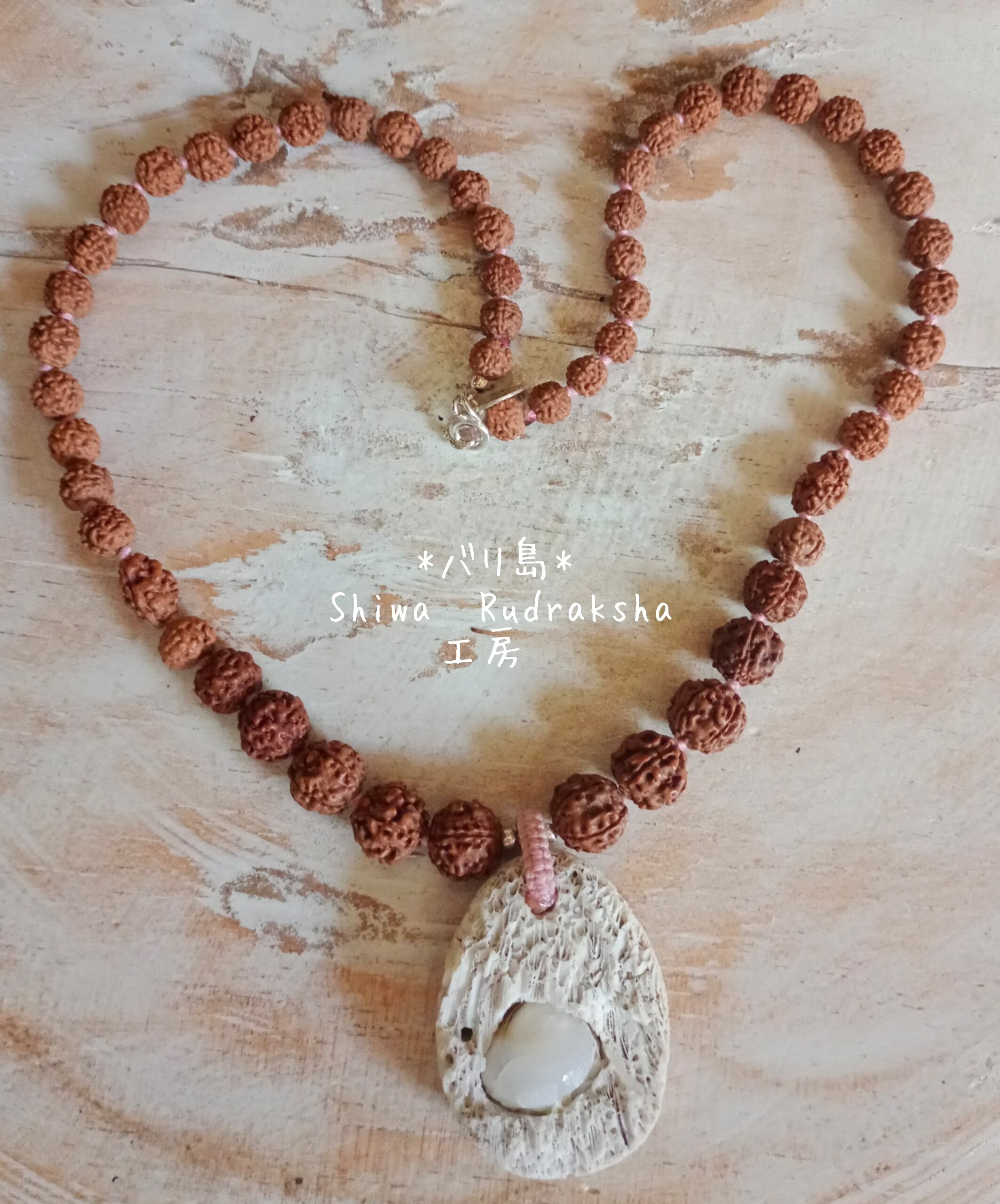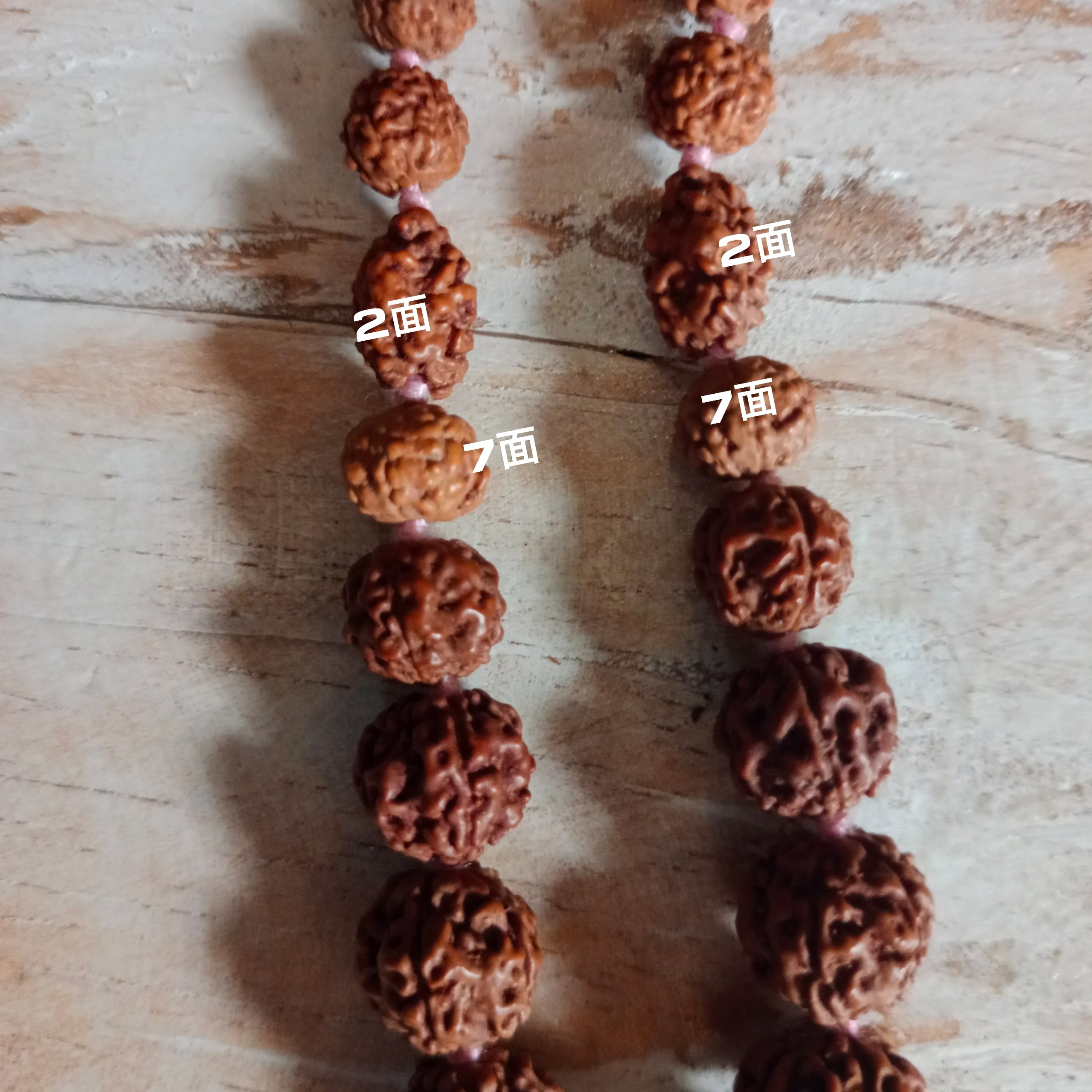 ルドラクシャは、ネックレス中央部に「幸福と繫栄」のルドラクシャ7面(ラクシュミー女神)と「人間関係を円滑にし、家族の絆を深める」と言われるルドラクシャ2面(シヴァ&パールヴァティ)を組み入れました。