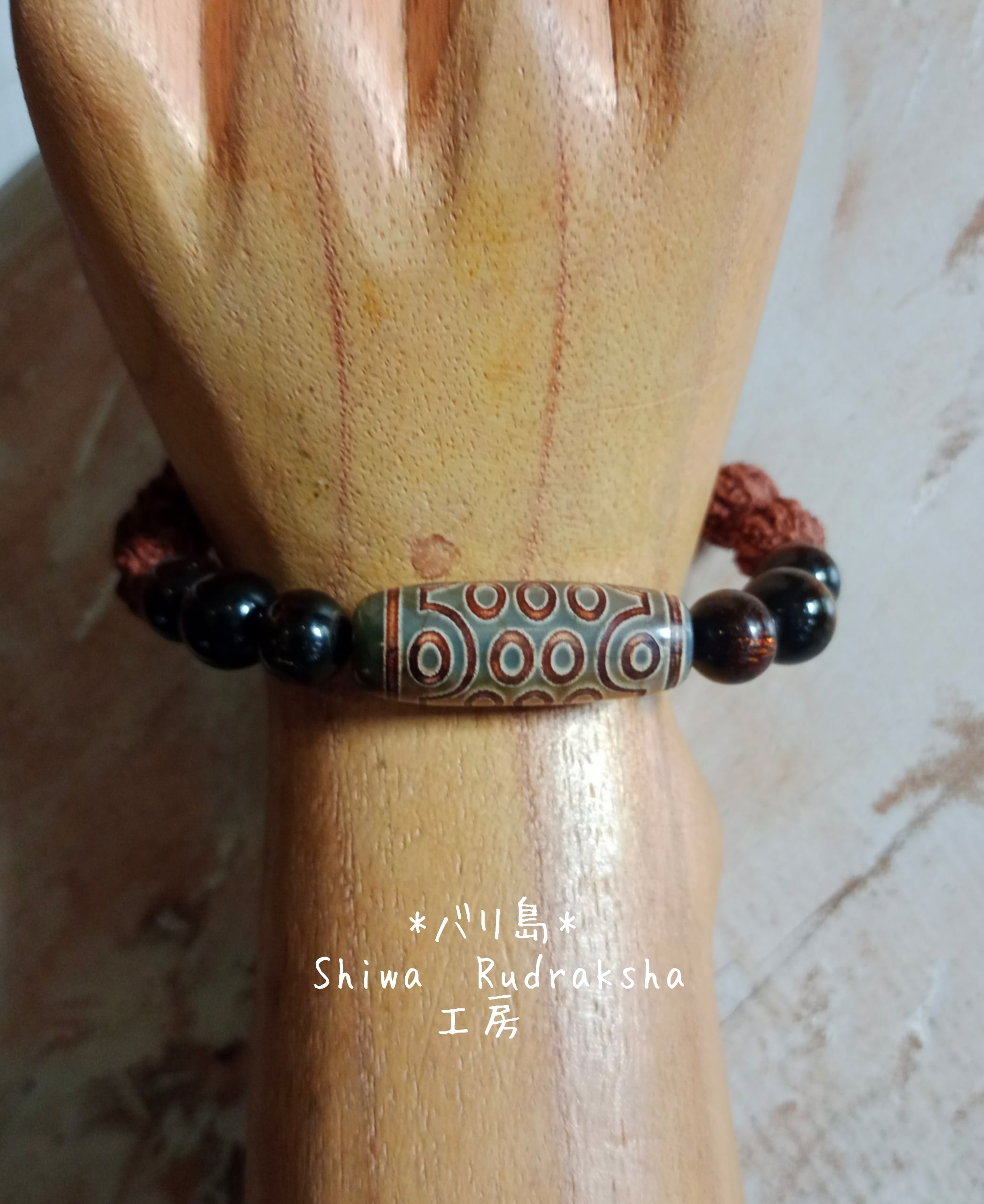 チベットの「天珠」をメインに、ルドラクシャとゴールドウリビーズを組み入れたブレスレットです。