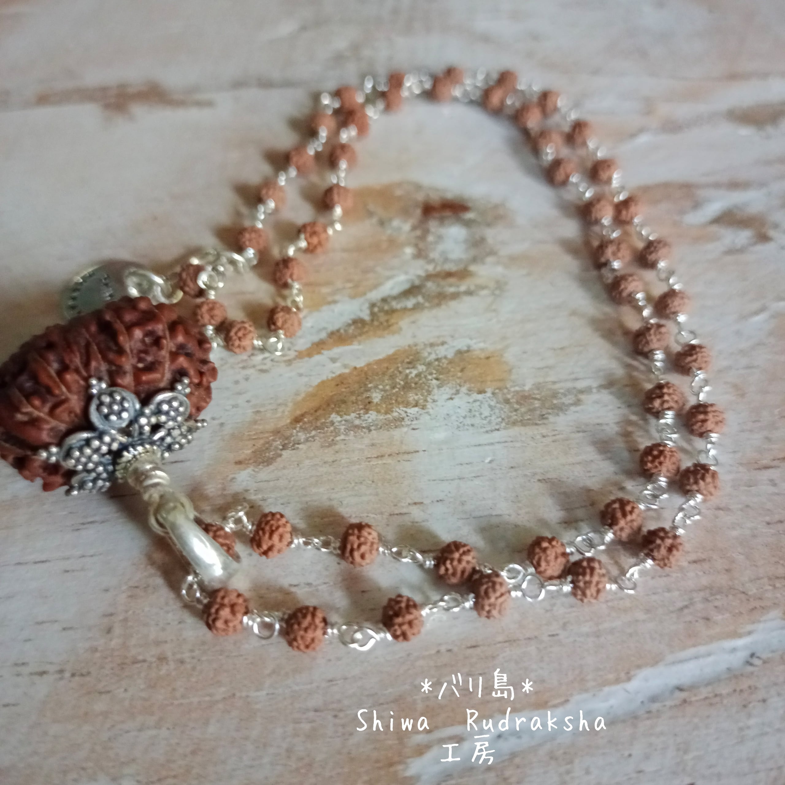 大粒15面ルドラクシャ(パシュパティ神 )に、シルバーキャップ加工した、小粒ルドラクシャのネックレスです。