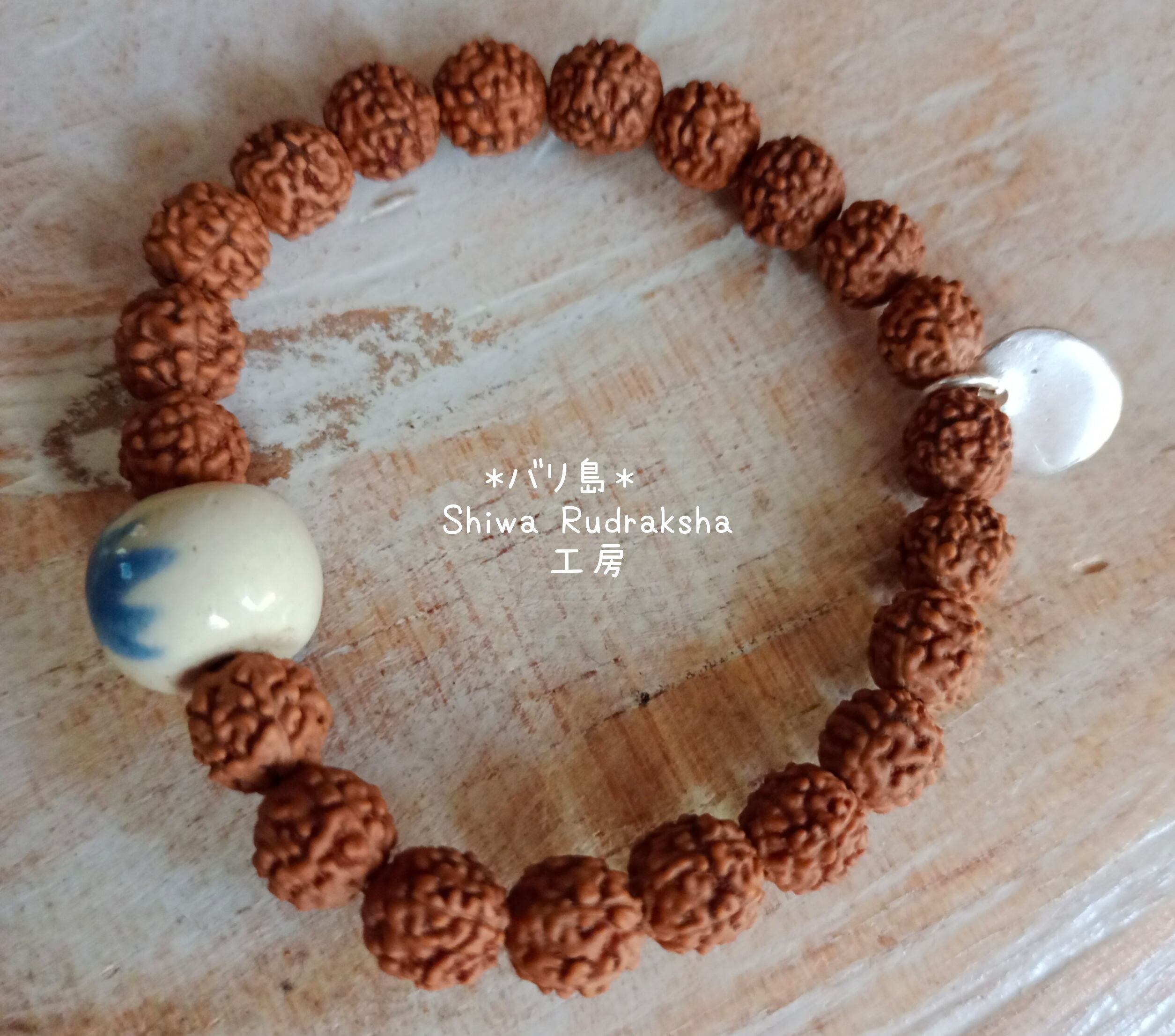 『ロータス』のマークが入った陶器のロンデルをメインにした、オール5面のルドラクシャブレスレットです。