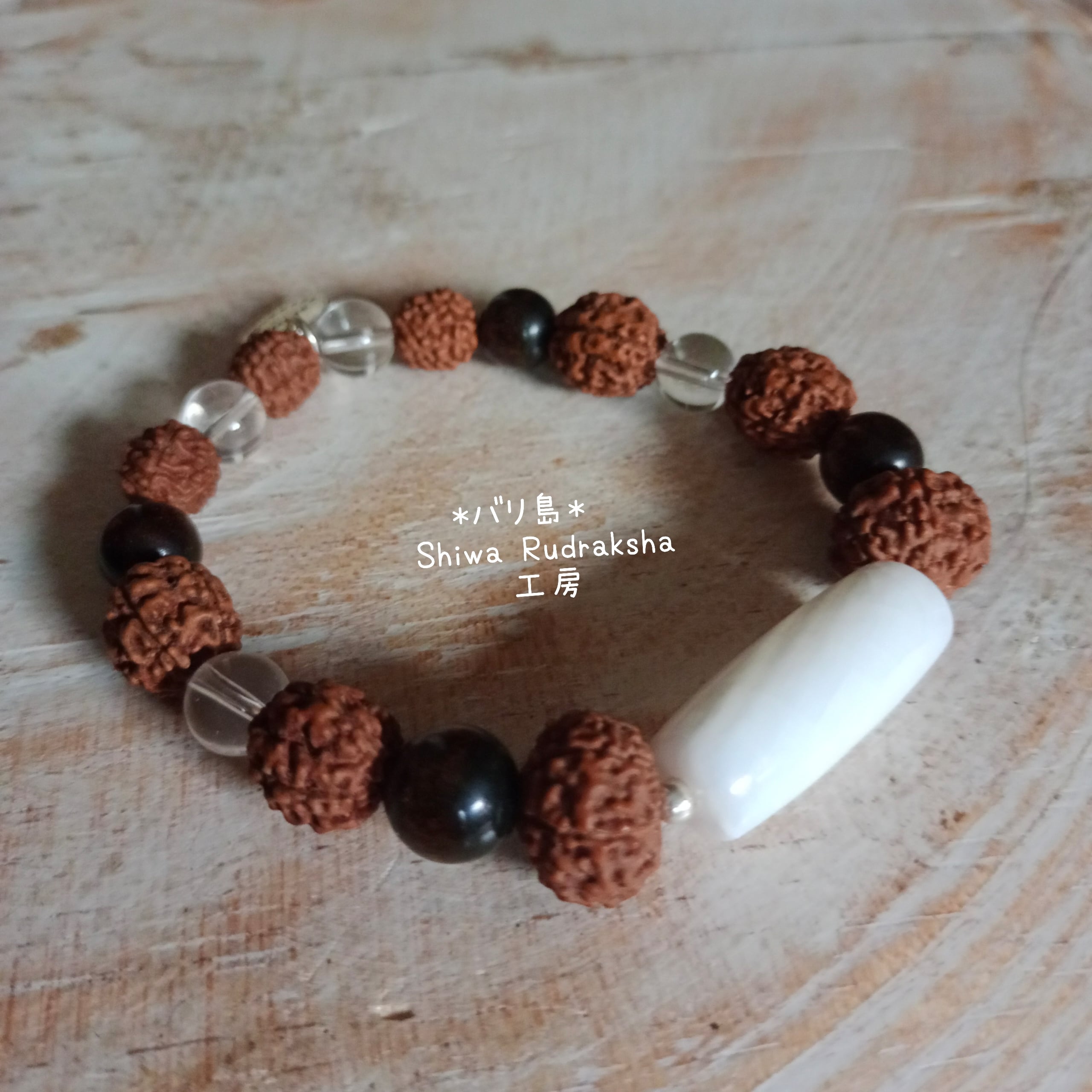 そのロンデルをメインにしたブレスレットには、珊瑚の木「ゴールドウリ」と、「クリスタル水晶」にルドラクシャを組み入れました。