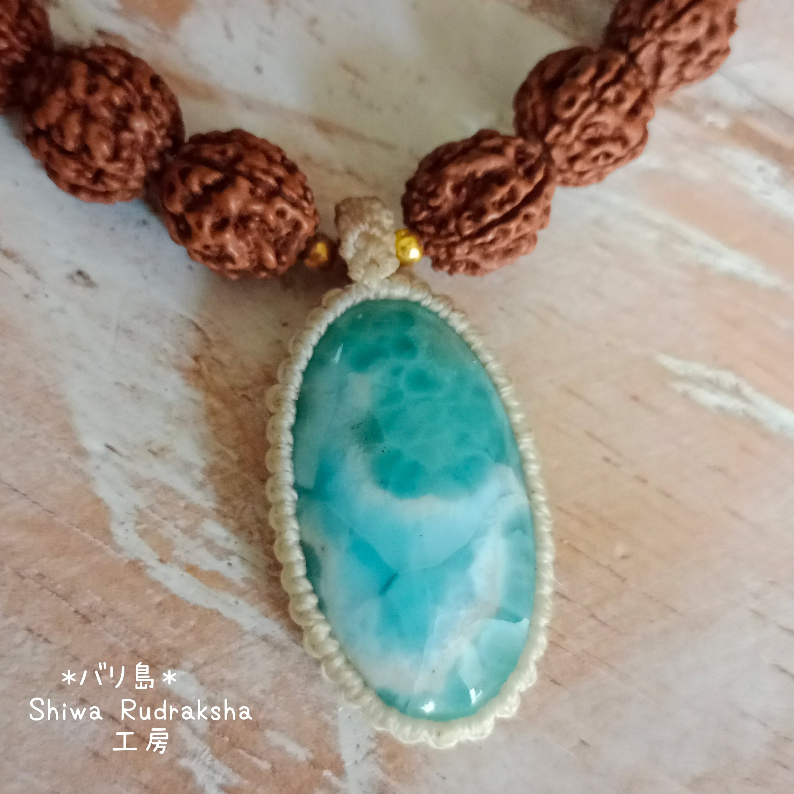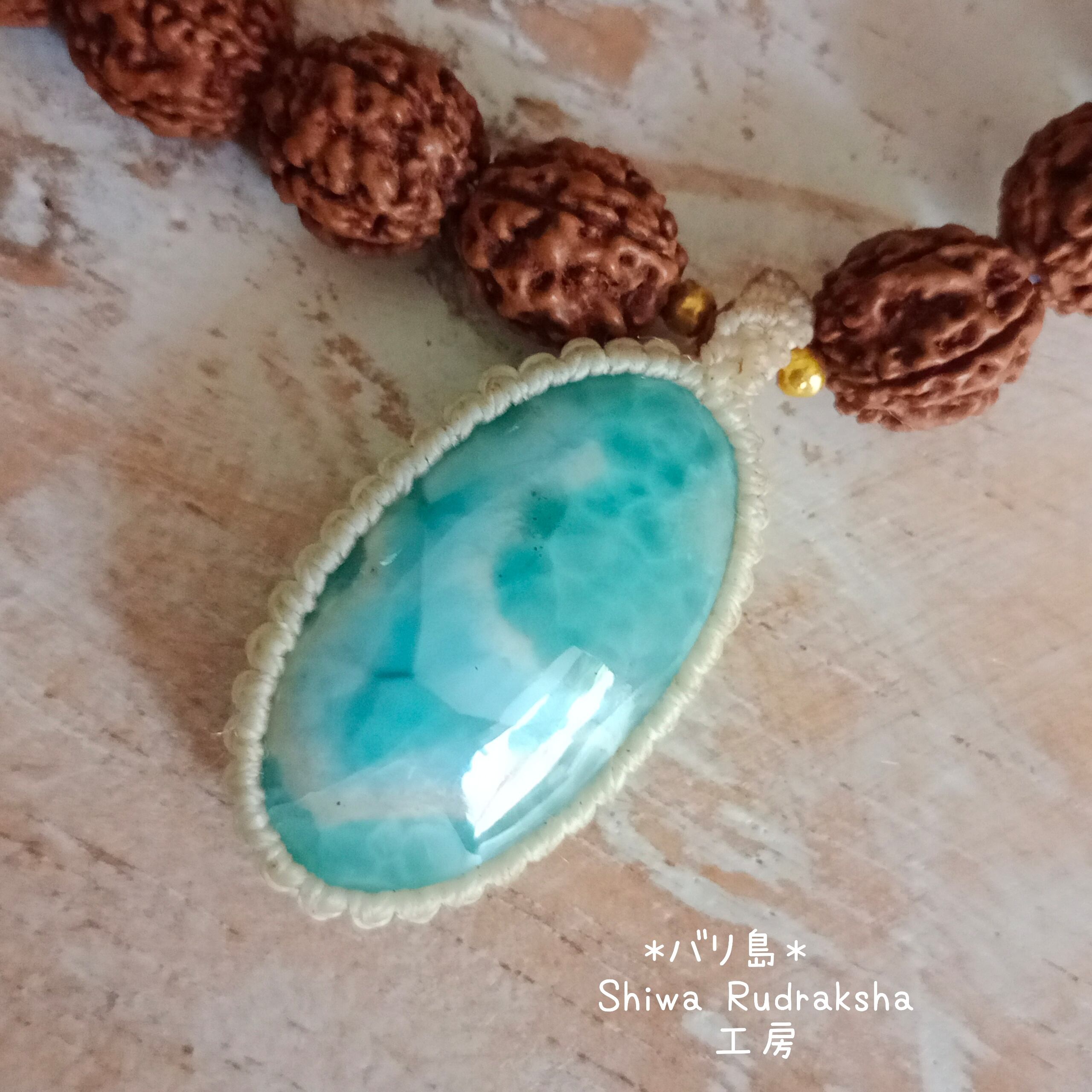 ドミニカ共和国産『ラリマー』をマクラメ加工のペンダントトップにしたルドラクシャネックレスです。