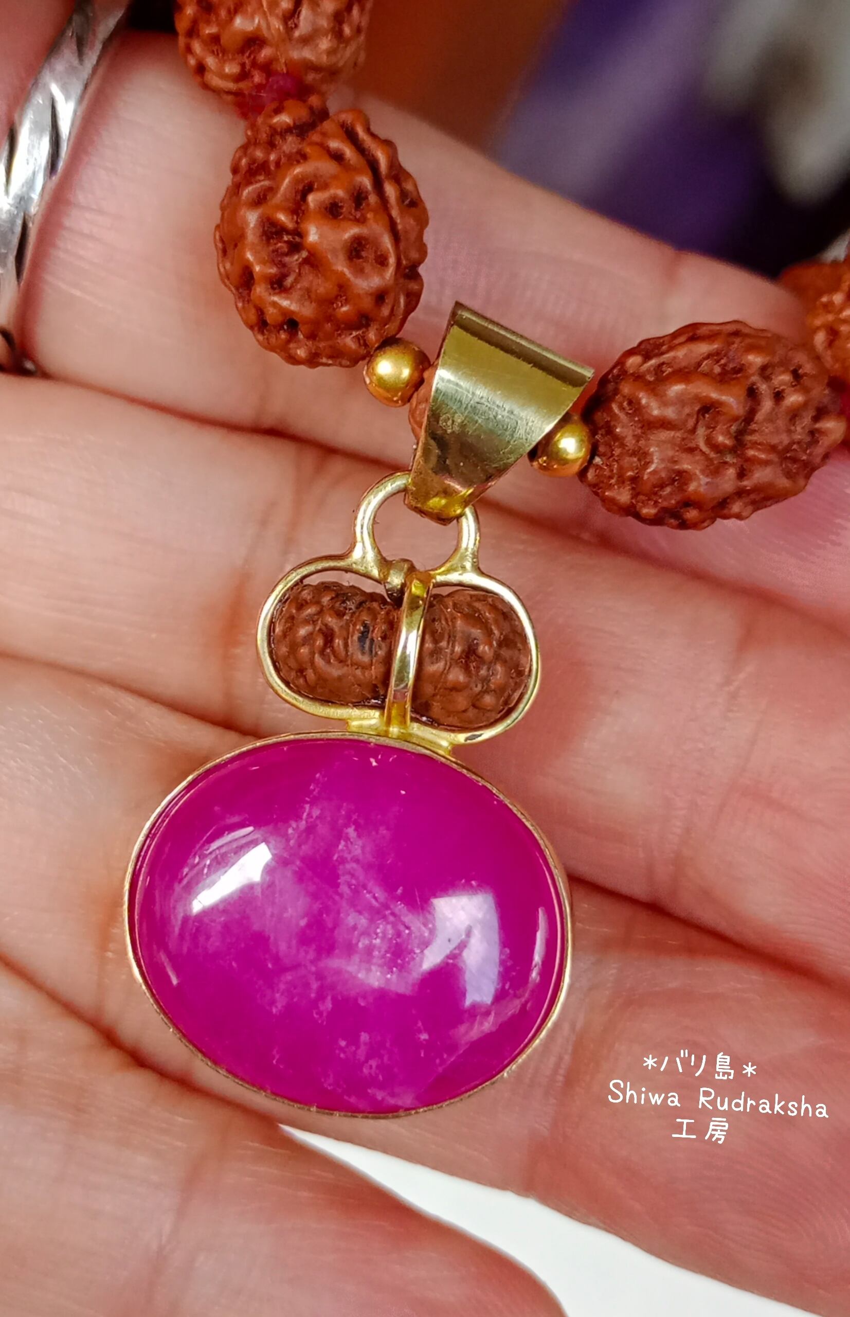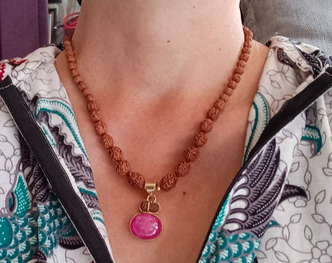 美しいピンクの『アフリカンルビー』と、16面ルドラクシャを付けたペンダントトップの、ノット(マーラーのように糸を結ぶ)タイプのネックレスです。