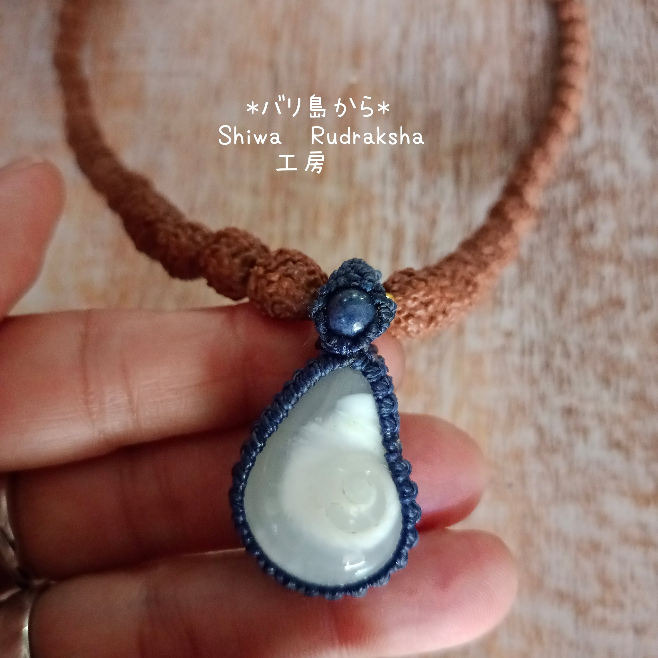 「ケオン」の渦巻部分を「ブルーサファイア」のストーンを装飾にした、マクラメ加工ペンダントトップを付けた紐ネックレスです。