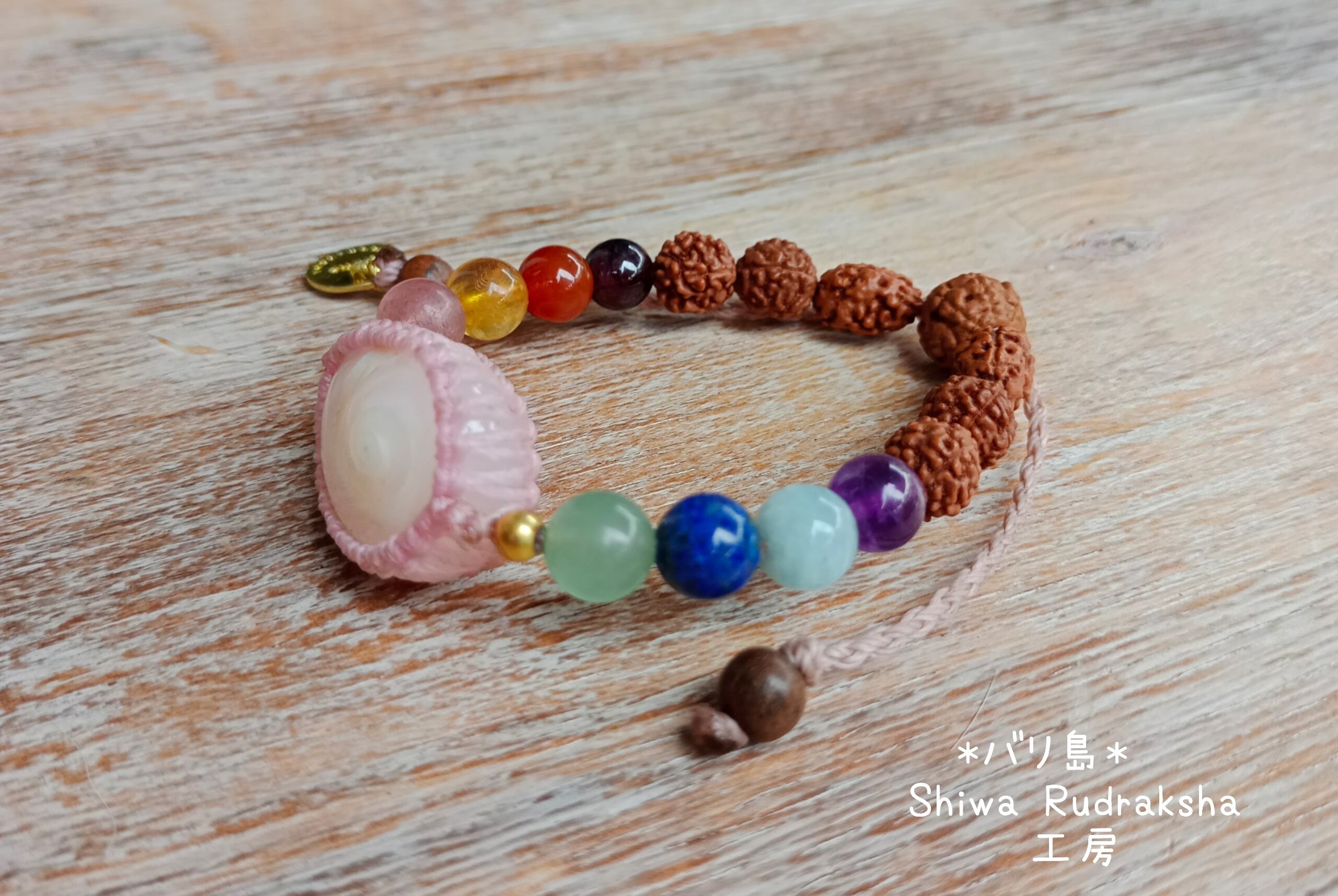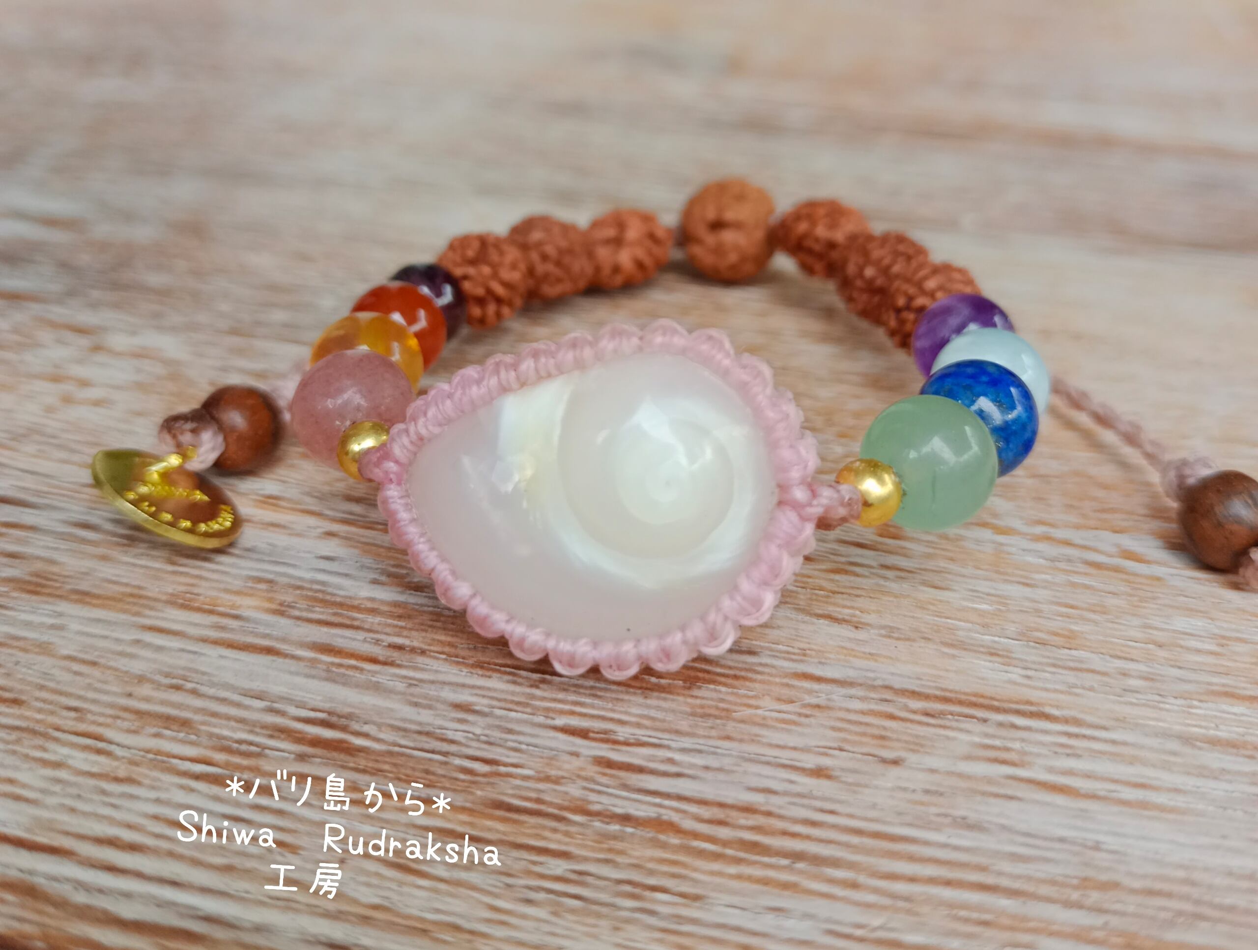 「ケオン」の渦巻部分をマクラメ加工して、8色のチャクラカラーストーン(ハートチャクラをグリーンとピンクの2色入れています。)と、ルドラクシャを使った調整可能な紐ブレスレットです。