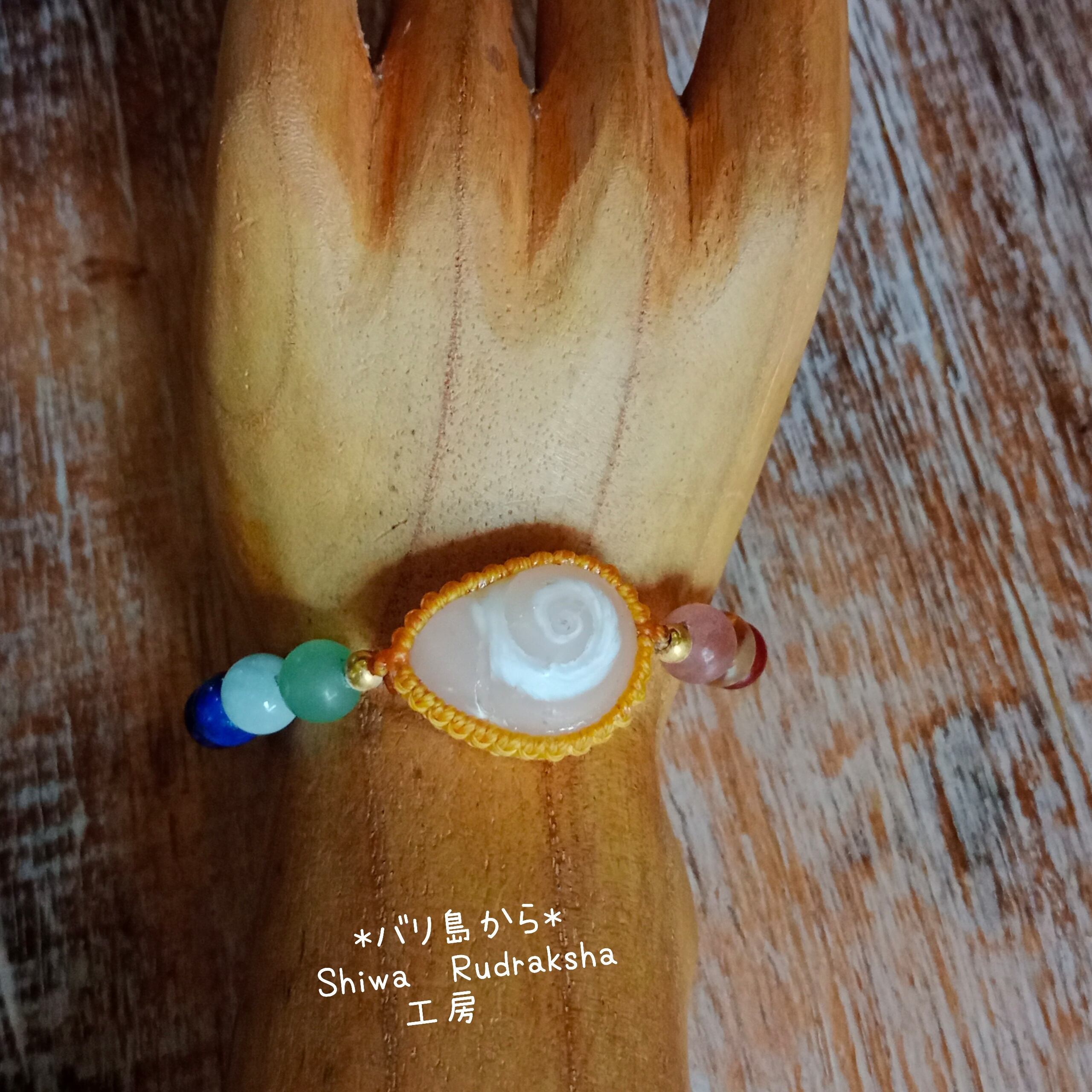 「ケオン」の渦巻部分をマクラメ加工して、8色のチャクラカラーストーン(ハートチャクラをグリーンとピンクの2色入れています。)と、ルドラクシャを使った調整可能な紐ブレスレットです。