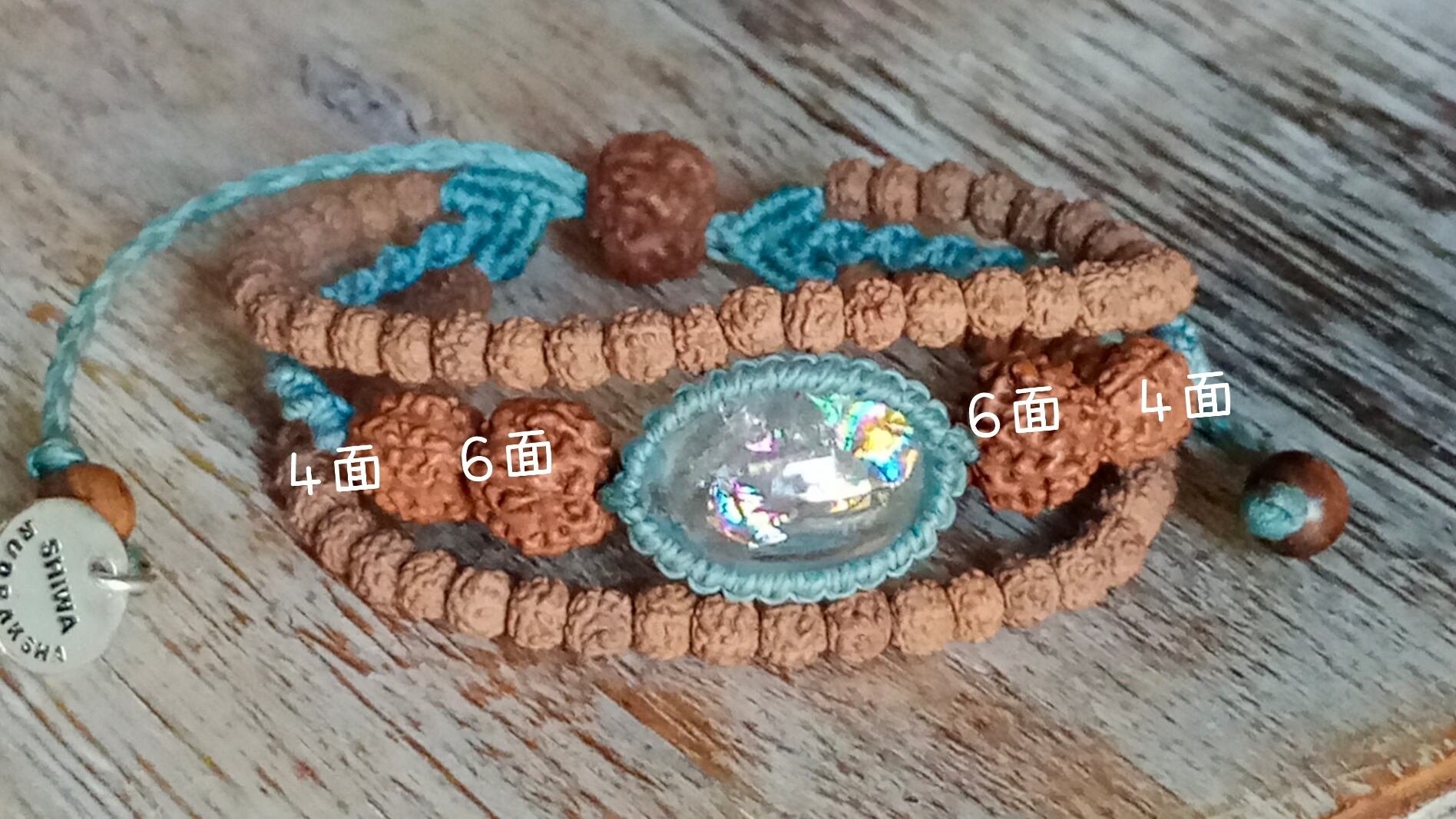 ルドラクシャは、「芸術・音楽・学問・愛」の、女神「サラスヴァティ女神」をあらわす4面(ブラフマー)&6面(カルティケヤ)を、水晶の左右に組み入れて、紐の長さを調整するストッパー部分に8面を組み入れました。